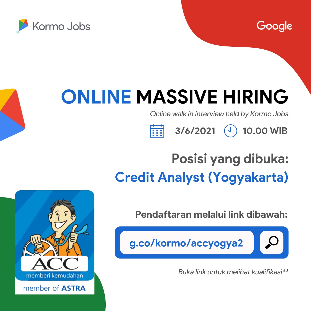 Astra Credit Companies (ACC) bekerjasama dengan Kormo Jobs kembali membuka Online Massive Hiring, dimana kamu memiliki kesempatan untuk menjadi bagian dari Insan ACC!