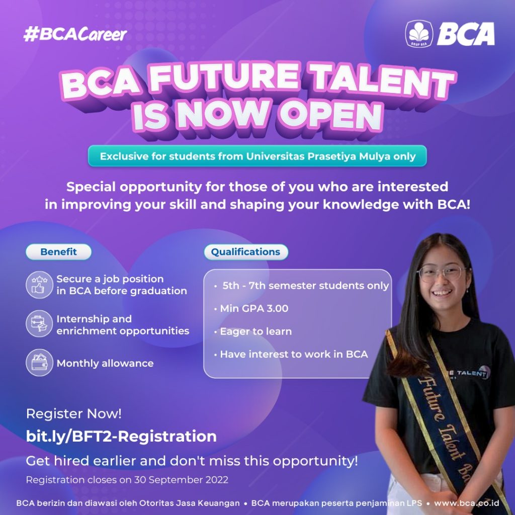 Hello future talents! BCA presents to you *BCA Future Talent Batch 2.* This program is suitable for 5th-7th semester university students who wants to boost their skills and explore the fields in banking. Worry not, this program give you the chance to explore all the extraordinary benefits including securing a job position in BCA before you graduate! For more info and registration: bit.ly/BFT2-Registration Don’t miss your chance to be the next future talents! Registration closes on 30 September 2022