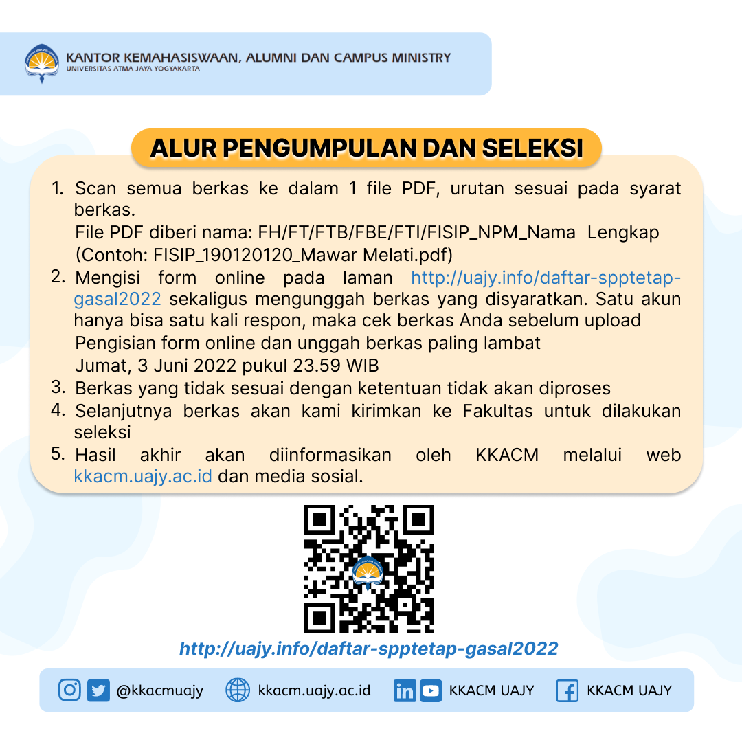 2) Mengisi form dan mengunggah berkas pada link berikut ini https://uajy.info/daftar-spptetap-gasal2022. Satu akun hanya bisa memberikan satu kali respon, maka cek berkas sebelum submit.
