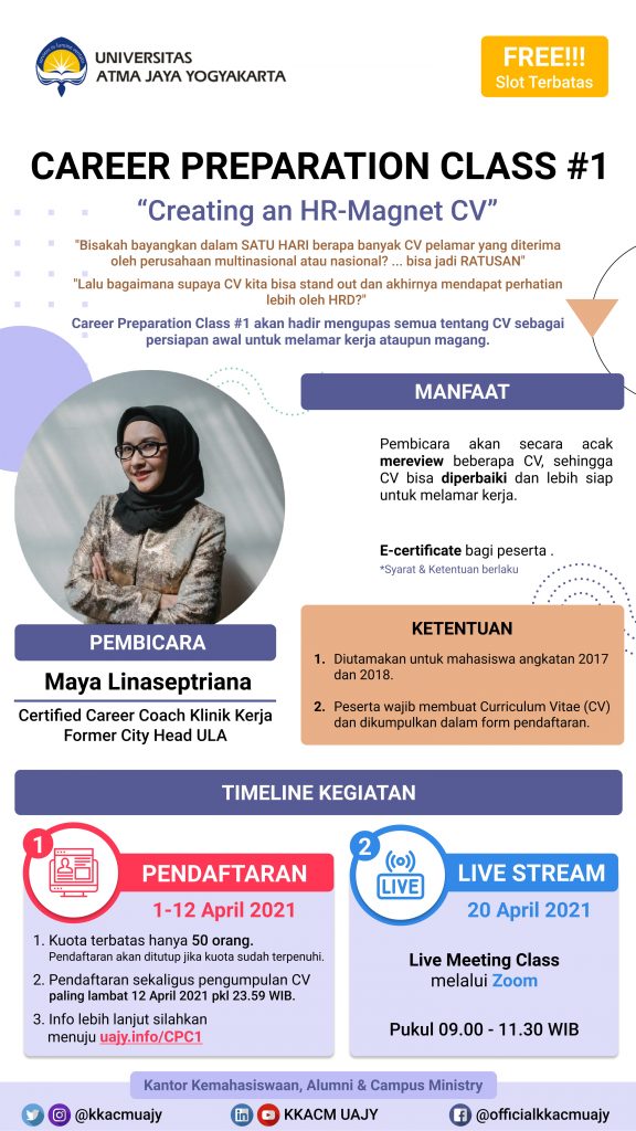 Career Preparation Class #1 akan hadir bersama KKACM UAJY dengan tema “Career an HR_Magnet CV” untuk mengupas tuntas CV sebagai persiapan awal untuk melamar kerja ataupun magang lohhh