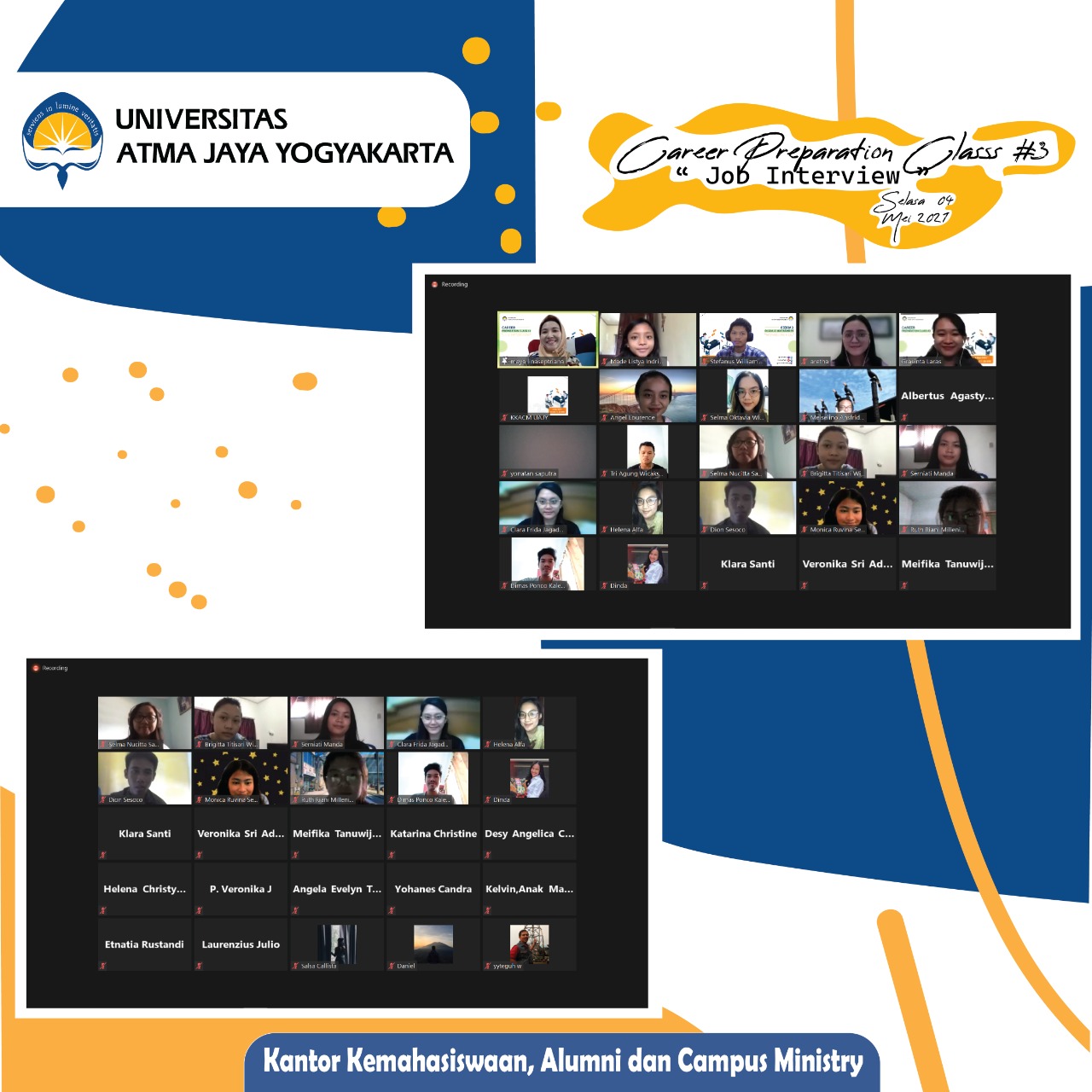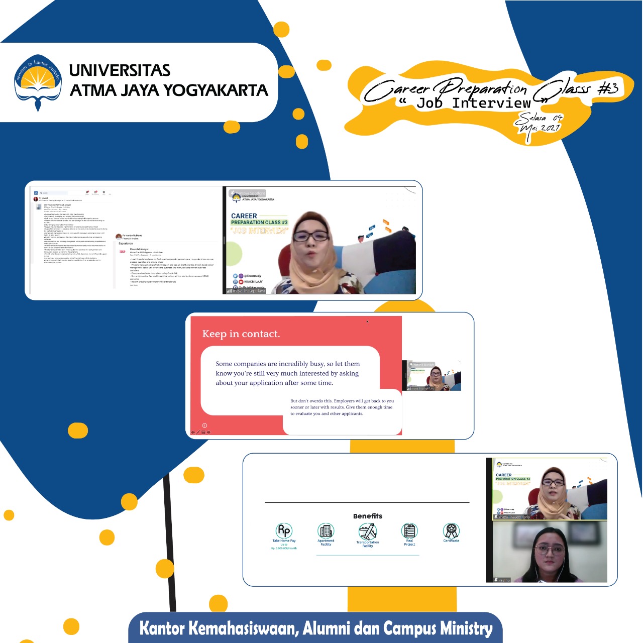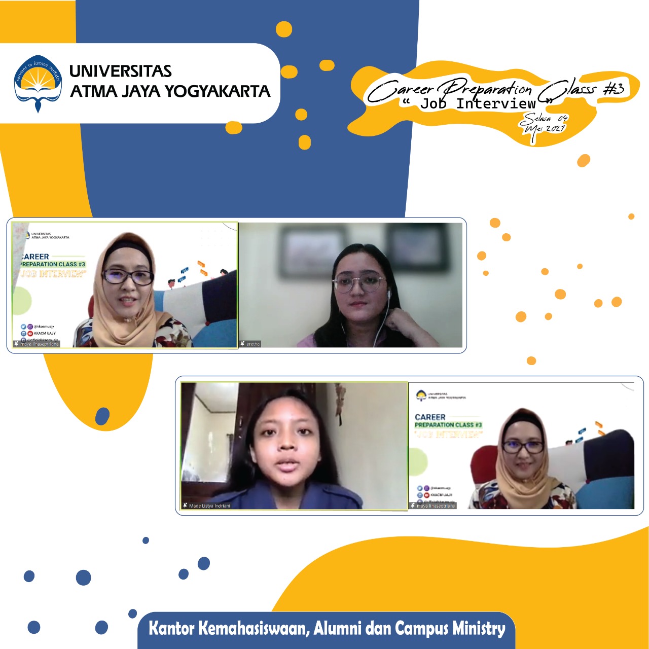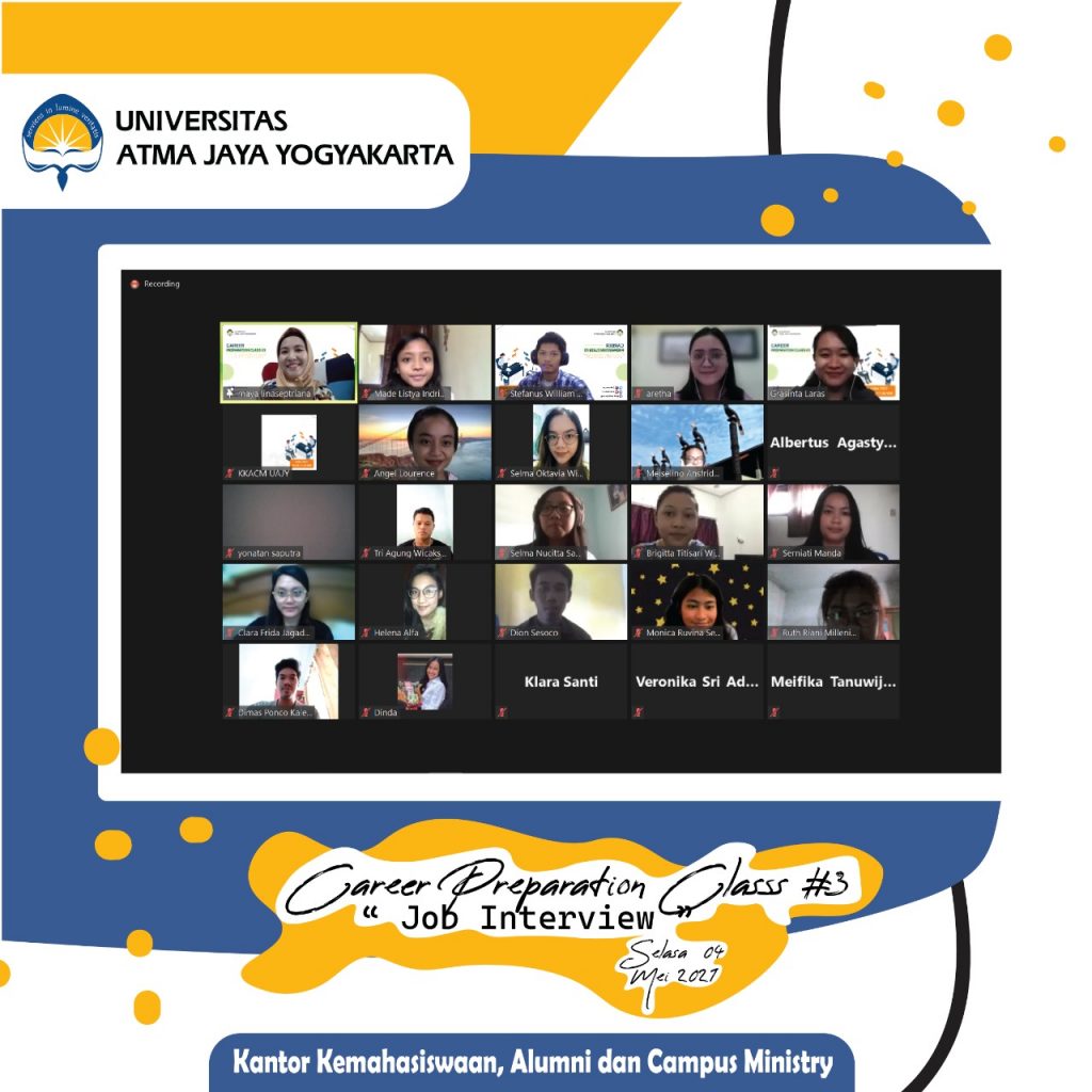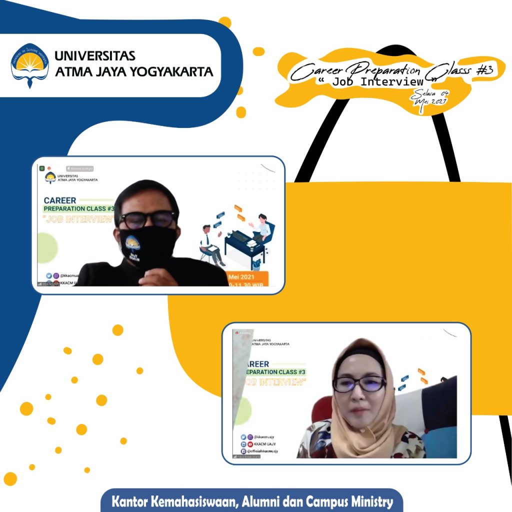 Universitas Atma Jaya Yogyakarta telah dilaksanakan oleh Kantor Kemahasiswaan Alumni dan Campus Ministry (KKACM) dengan tema “Job Interview” pada tanggal 4 Mei 2021.