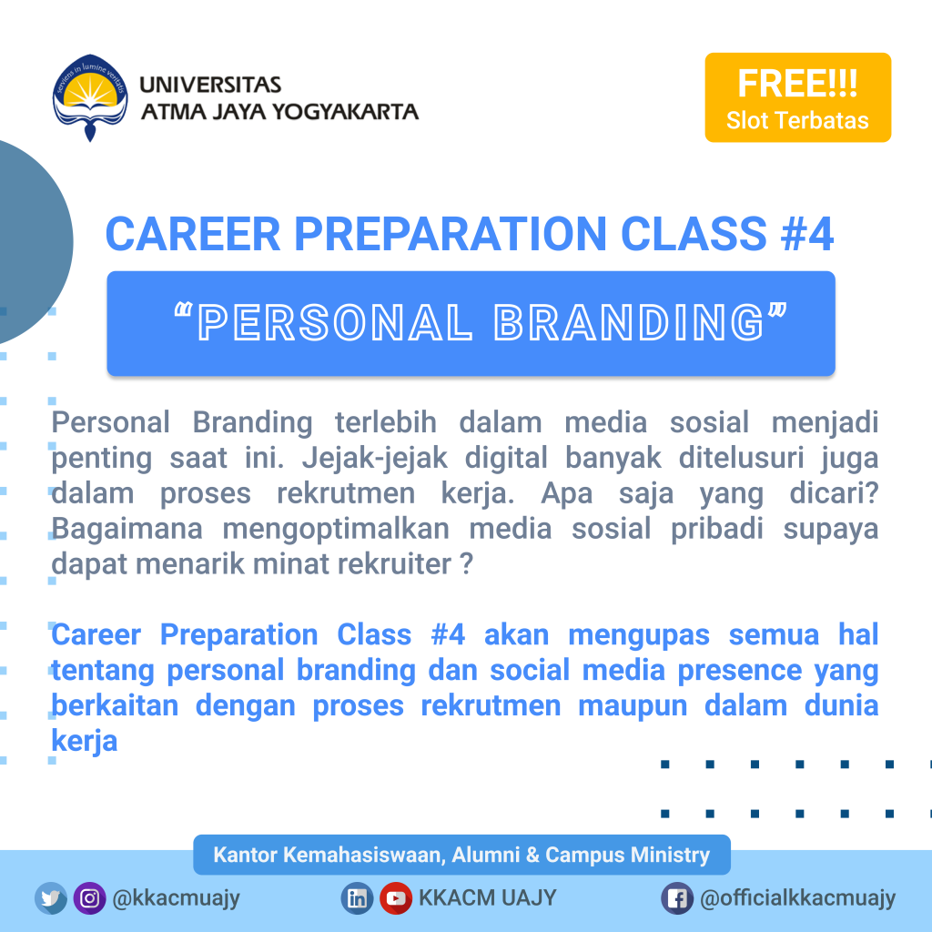 Career Preparation Class #4 akan hadir kembali bersama KKACM UAJY dengan tema “Personal Branding” untuk mengupas tuntas hal tentang personal branding dan social media prensence yang berkaitan dengan proses rekrutmen maupun dalam dunia kerja lohhh🤗