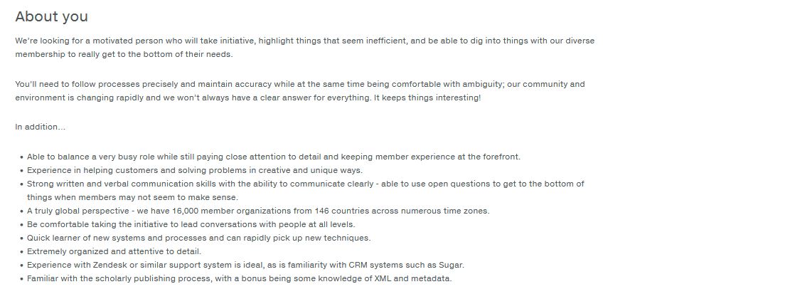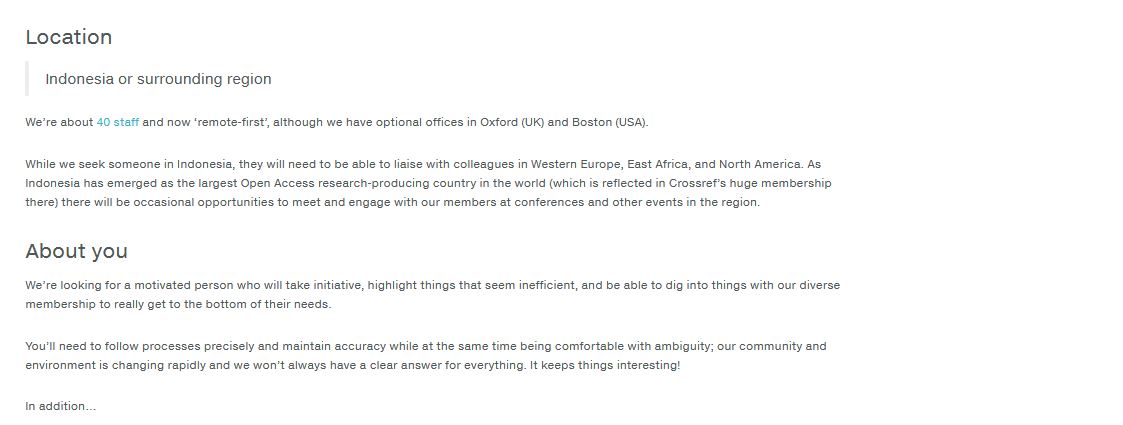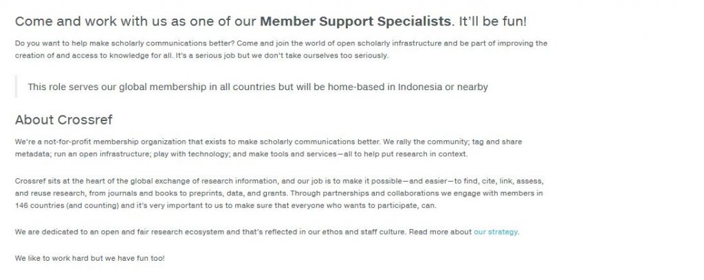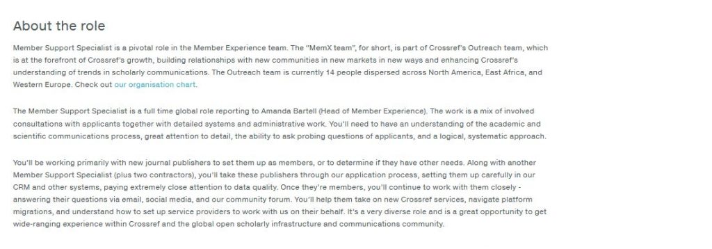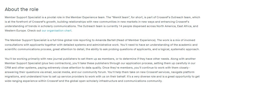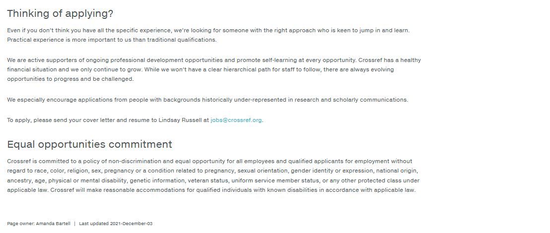 To apply, please send your cover letter and resume to Lindsay Russell at jobs@crossref.org