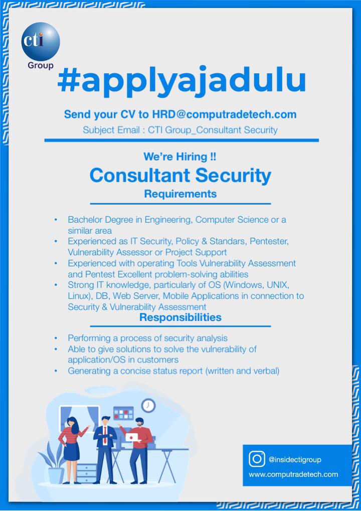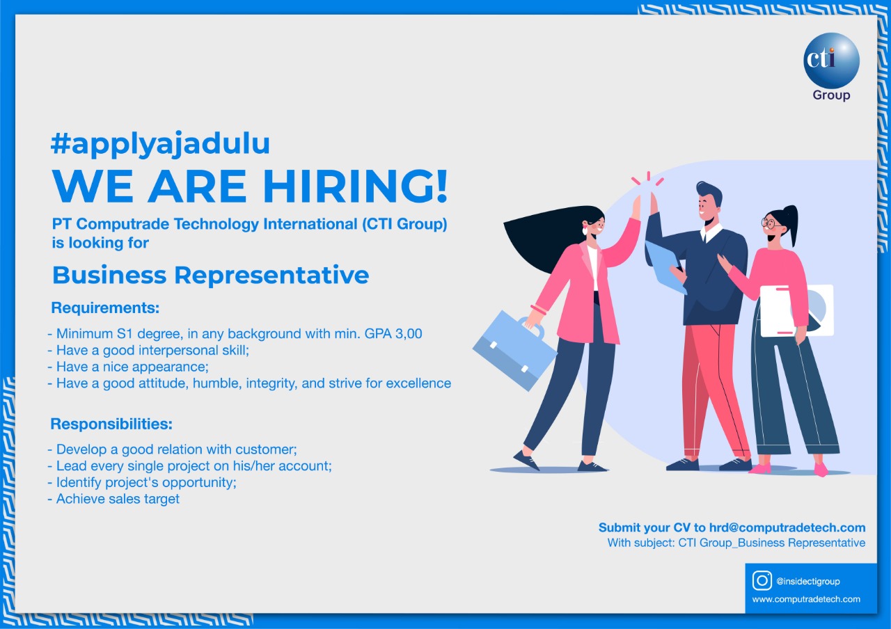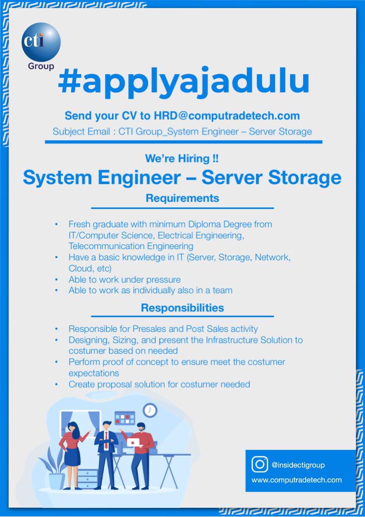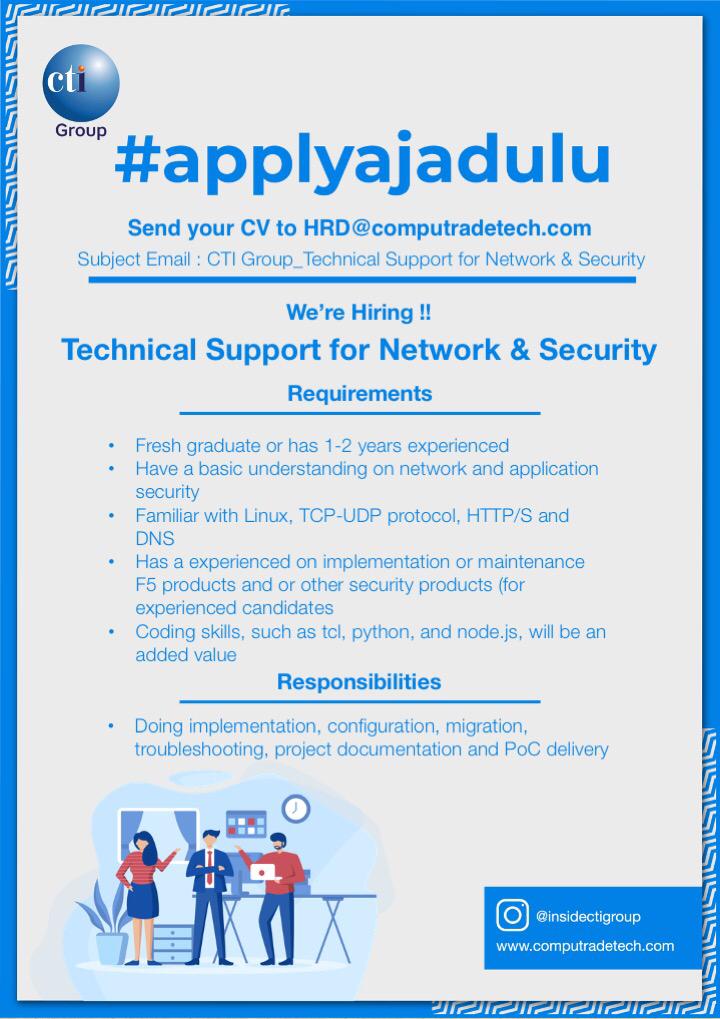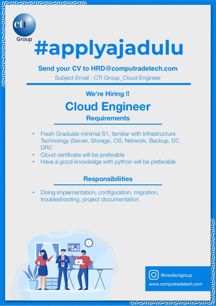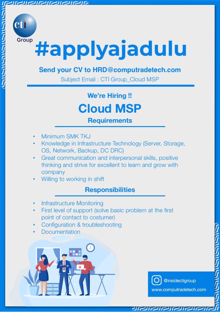 Info lowongan pekerjaan CTI GROUP, Posisi yang dibutuhkan:1. Bussines Representative2. Cloud Engineer3. Cloud MSP4. Consultant Security5. System Engineer Network6. System Engineer – Server Storage7. Techincal Support