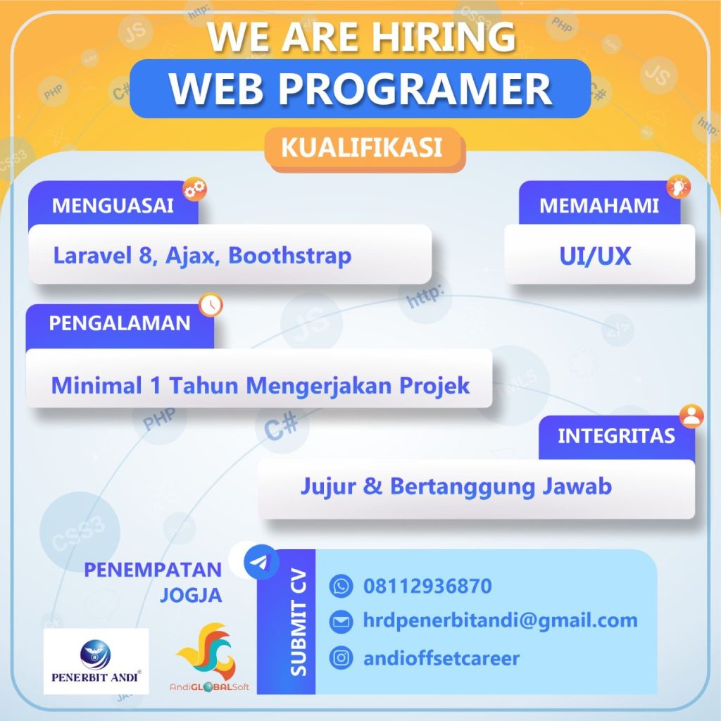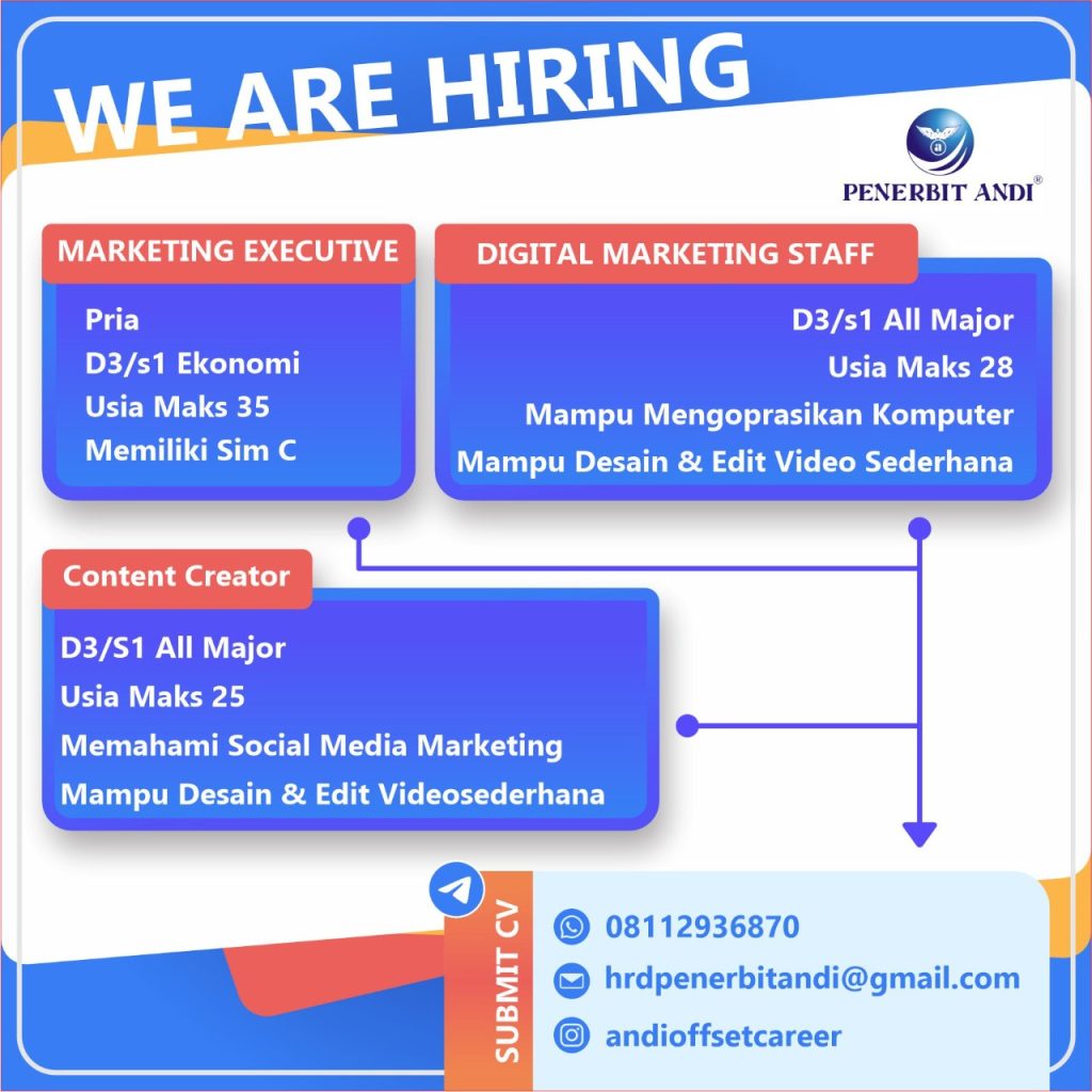 Info lowongan pekerjaan di Penerbit CV. Andi Offset. Posisi yang dibutuhkan:1. MARKETING EXECUTIVE2. DIGITAL MARKETING STAFF3. CONTENT CREATOR4. WEB PROGRAMER
