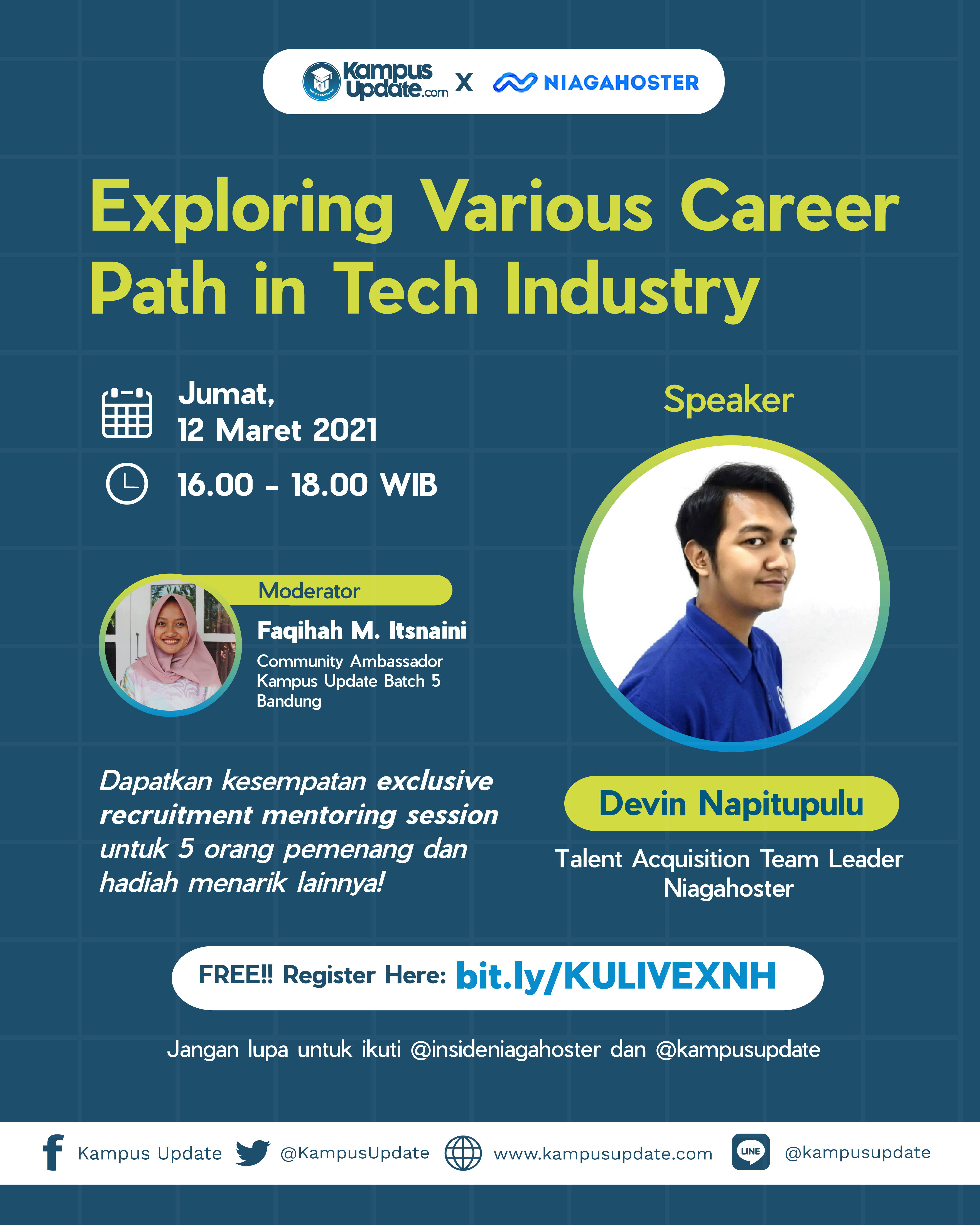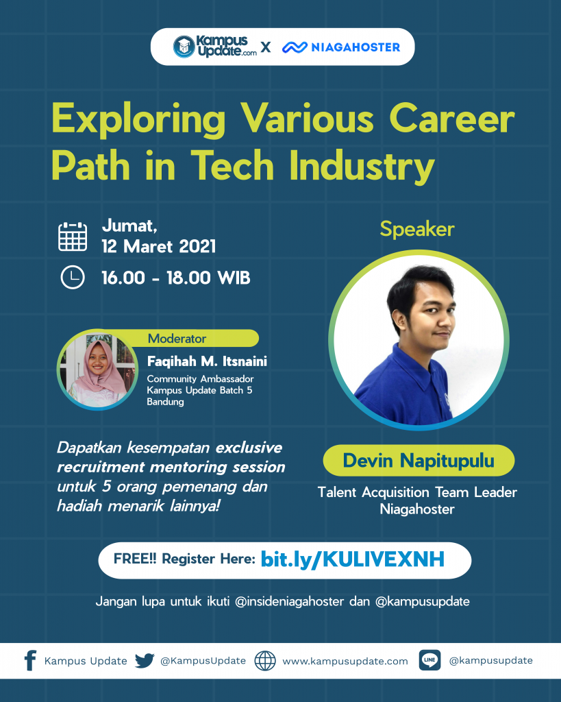 Dengan tema “Exploring Various Career Path in Tech Industry” yang akan dibawakan oleh Kak Devin Napitupulu (Talent Acquisition Team Leader Niagahoster) dan dimoderatori Kak Faqihah Muharroroh Itsnaini (Community Ambassador Kampus Update Batch 5 Bandung), kita akan menjawab semua pertanyaan dan keraguan Updaters mengenai karir di Industri Teknologi!