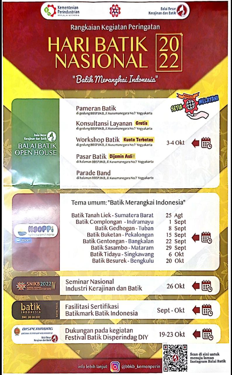 Halo Sobat Industri, semoga selalu sehat dan produktif Dalam rangka Peringatan Hari Batik Nasional, BBSPJI Kerajinan dan Batik Kemenperin kembali menggelar serangkaian kegiatan dengan tema “Batik Merangkai Indonesia” Untuk rangkaian acara bisa teman-teman perhatikan pada poster yang telah berlangsung mulai bulan Agustus kemarin dan masih banyak kegiatan lainnya di bulan Oktober mendatang