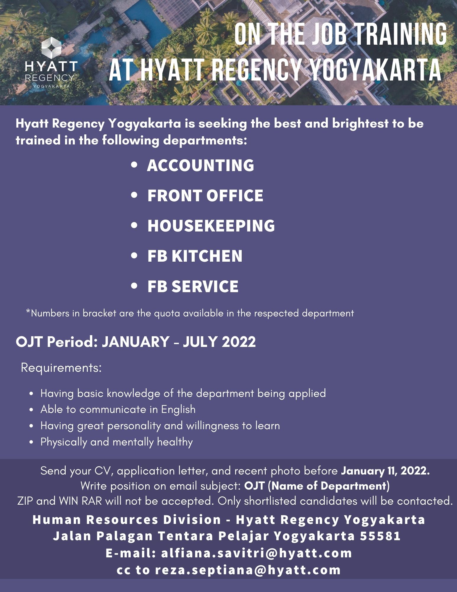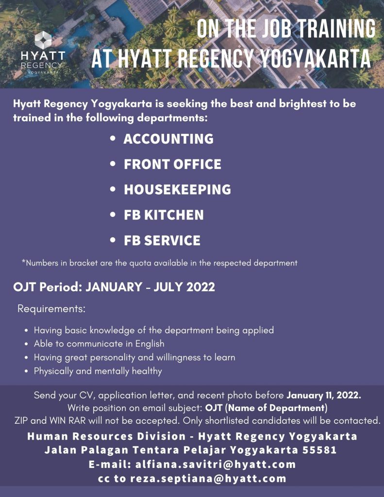 Info lowongan pekerjaan Hyatt Regency Yogyakarta, Posisi yang dibutuhkan:• Accounting• Front Office• Housekeeping• FB Kitchen• FB Service