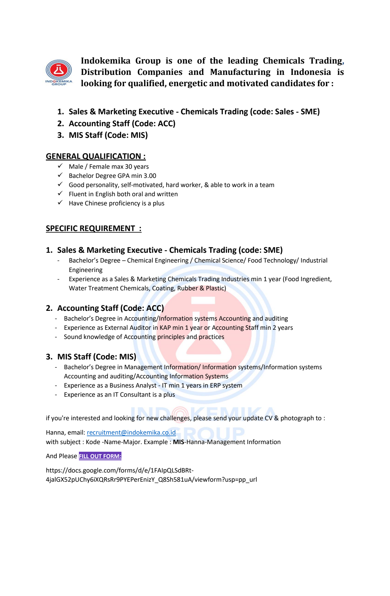 Info lowongan pekerjaan di Indokemika Group. Posisi yang dibutuhkan:1. Sales & Marketing Executive – Chemicals Trading2. Accounting Staff3. MIS Staff