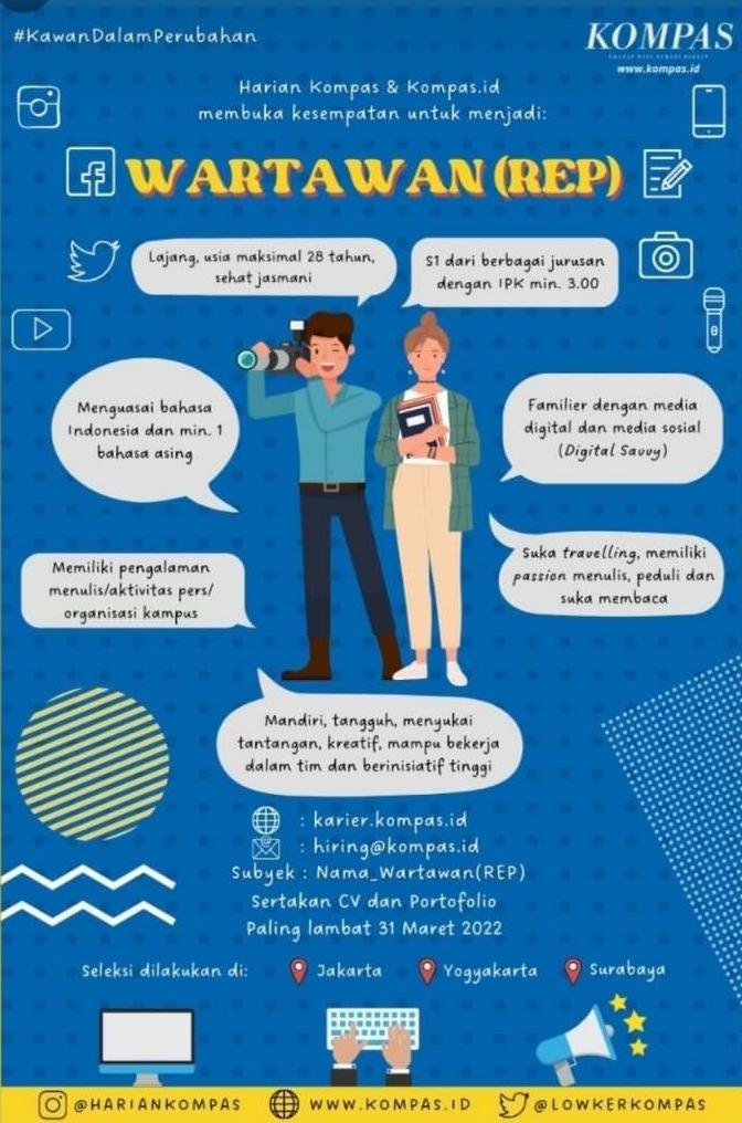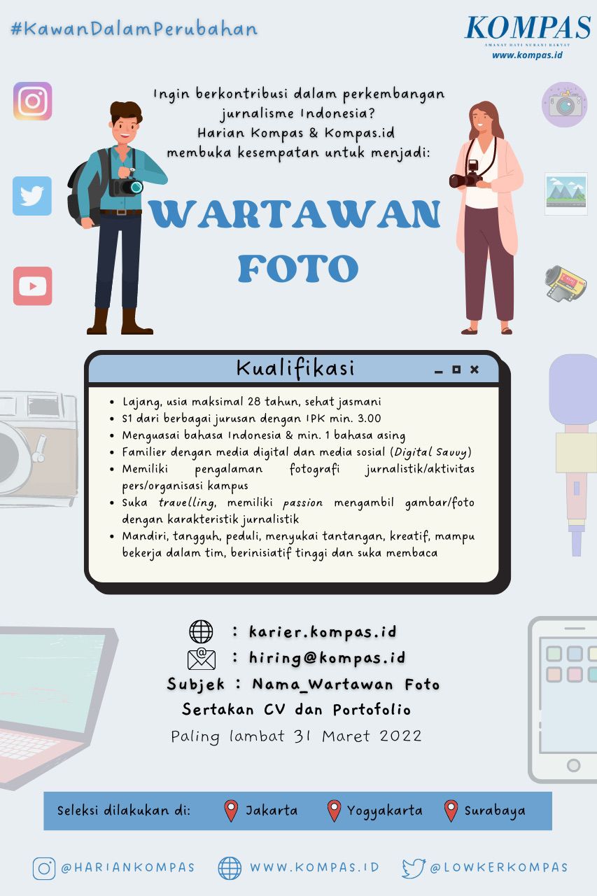 [LOWONGAN KERJA]Info lowongan pekerjaan KOMPAS, Posisi yang dibutuhkan:• Wartawan Foto• Wartawan (Rep)