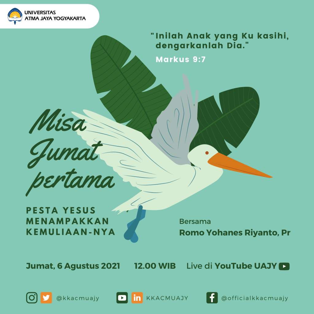 Mengundang segenap Civitas Academica UAJY dalam Misa Jumat Pertama bulan Agustus yang akan dipimpin oleh Rm. Yohanes Riyanto, Pr pada: