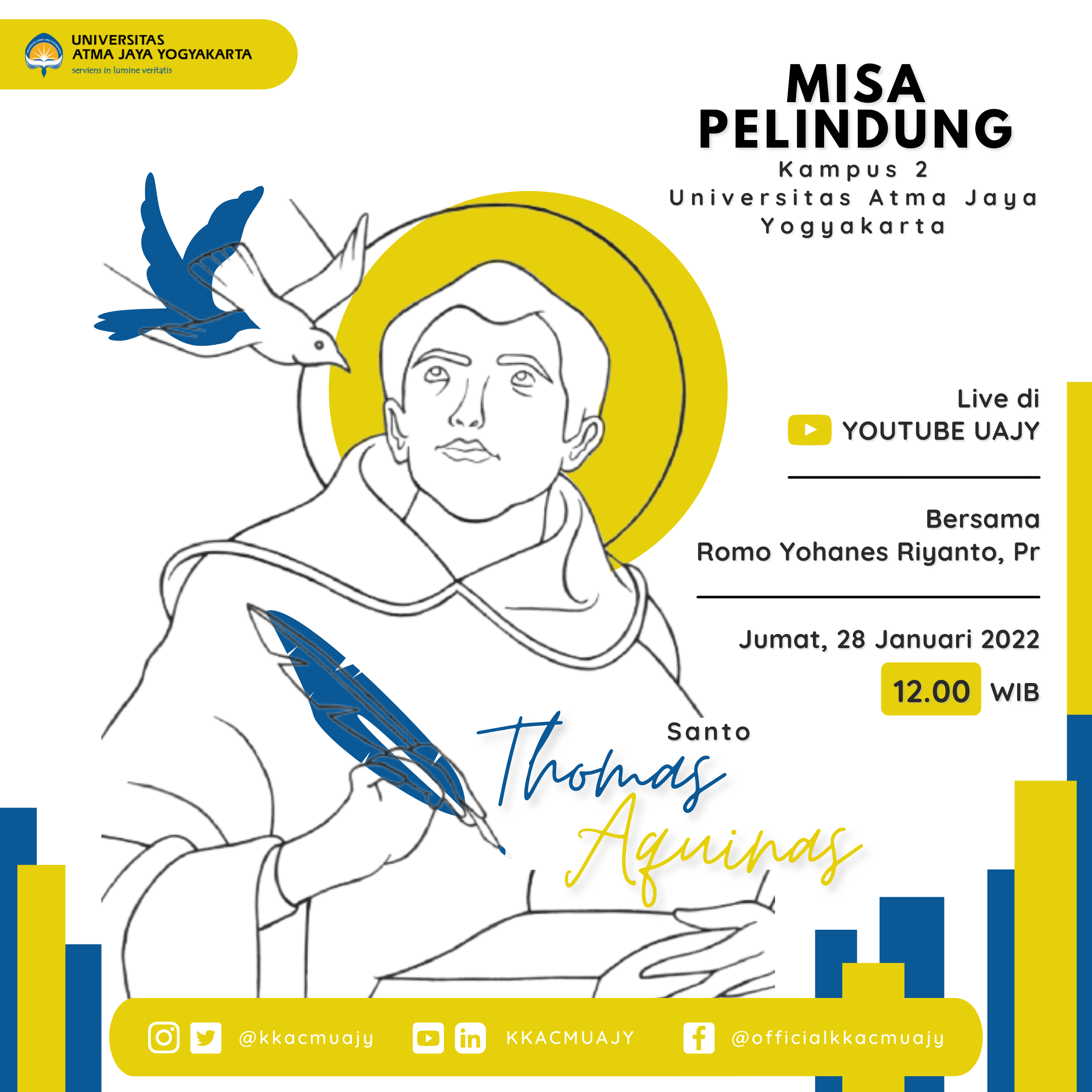 Mengundang segenap Civitas Academica UAJY dalam Misa Pesta Pelindung Kampus 2 UAJY Santo Thomas Aquinas yang akan dipimpin oleh Rm. Yohanes Riyanto, Pr pada: