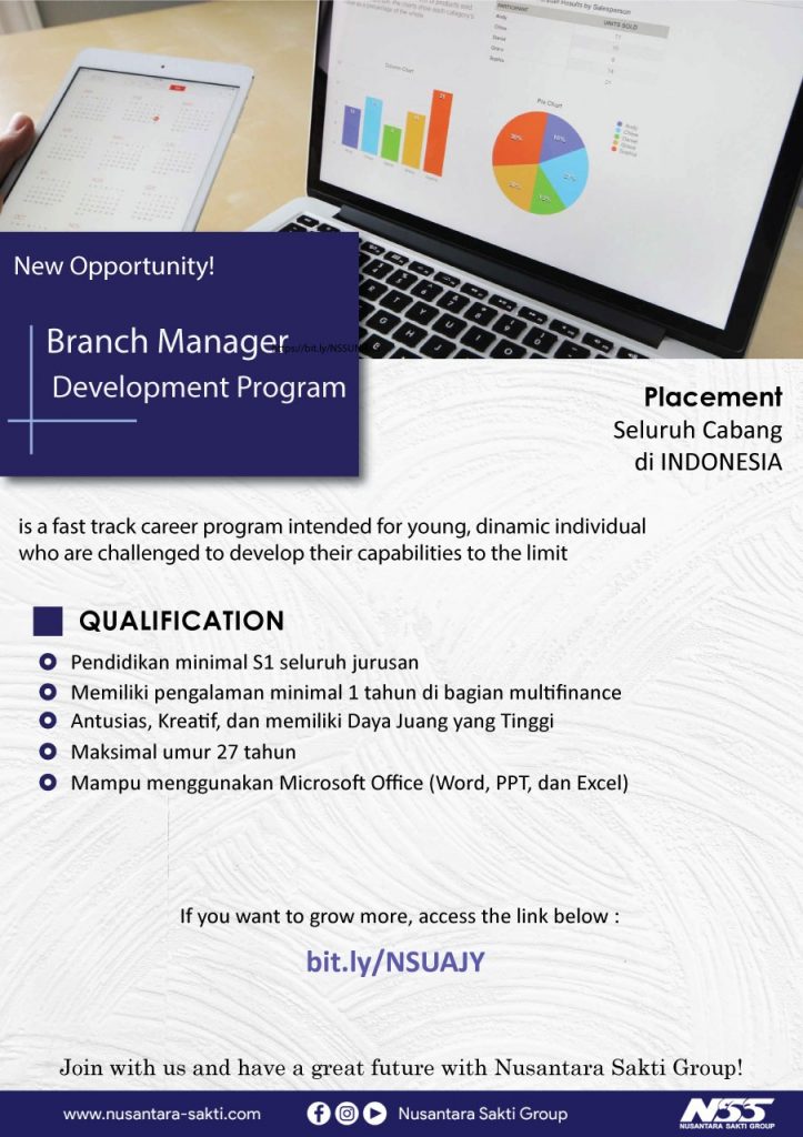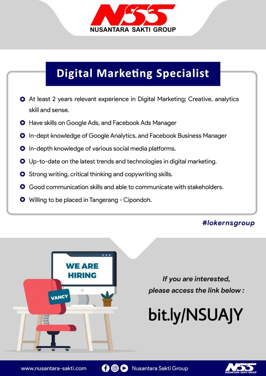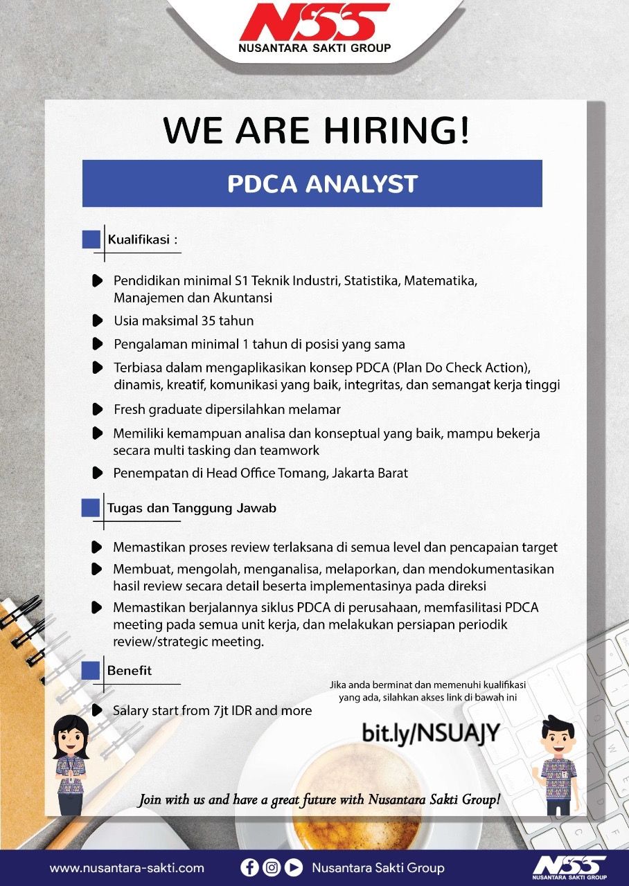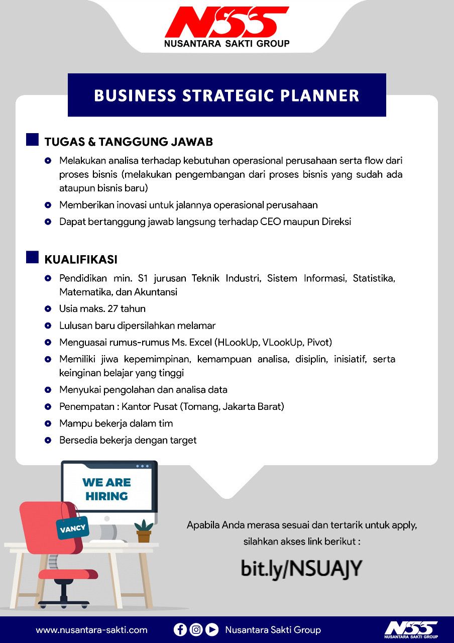 Info lowongan pekerjaanNusantara Sakti Group, Posisi yang dibutuhkan:• BMDP (Branch Manager Development Program)• Bussines Strategic Planner• Digital Marketing Spesialist• LDP (Leadership Development Program)• PDCA Analyst