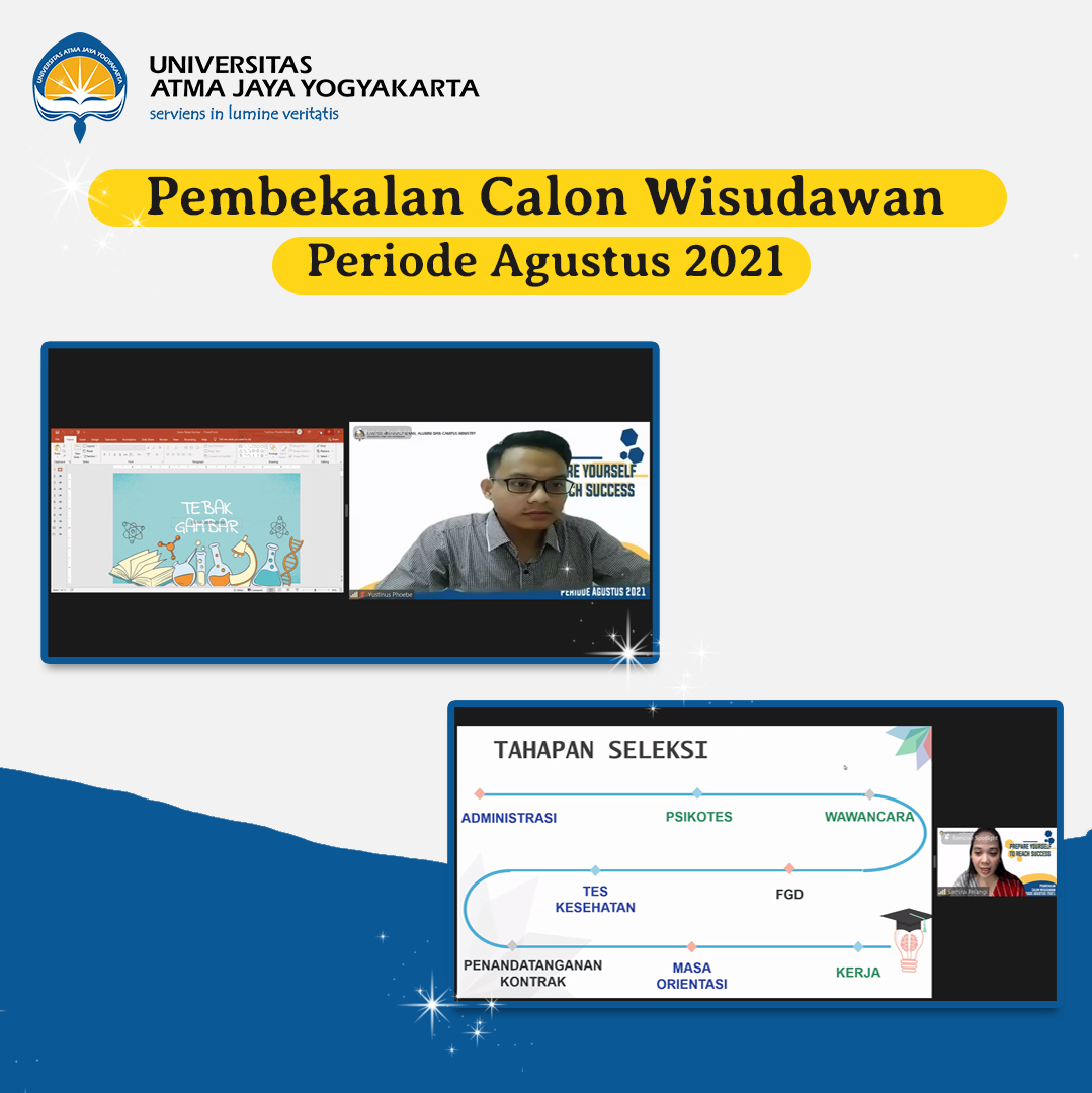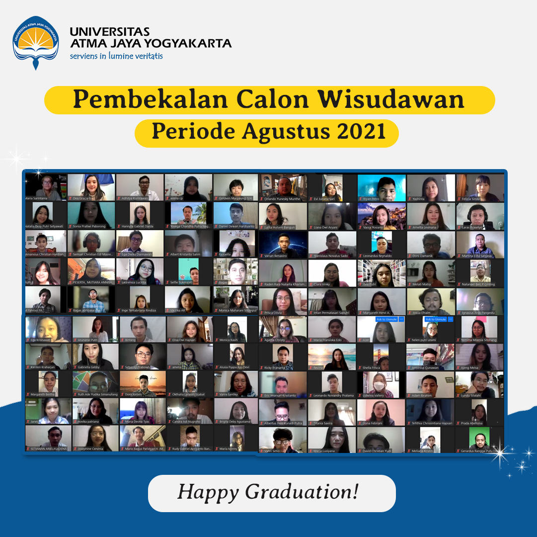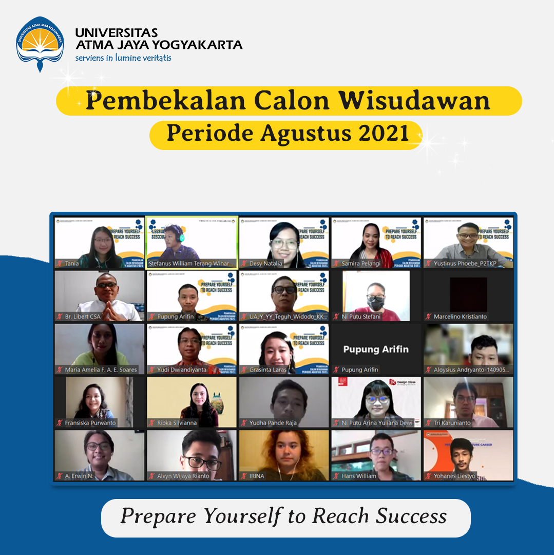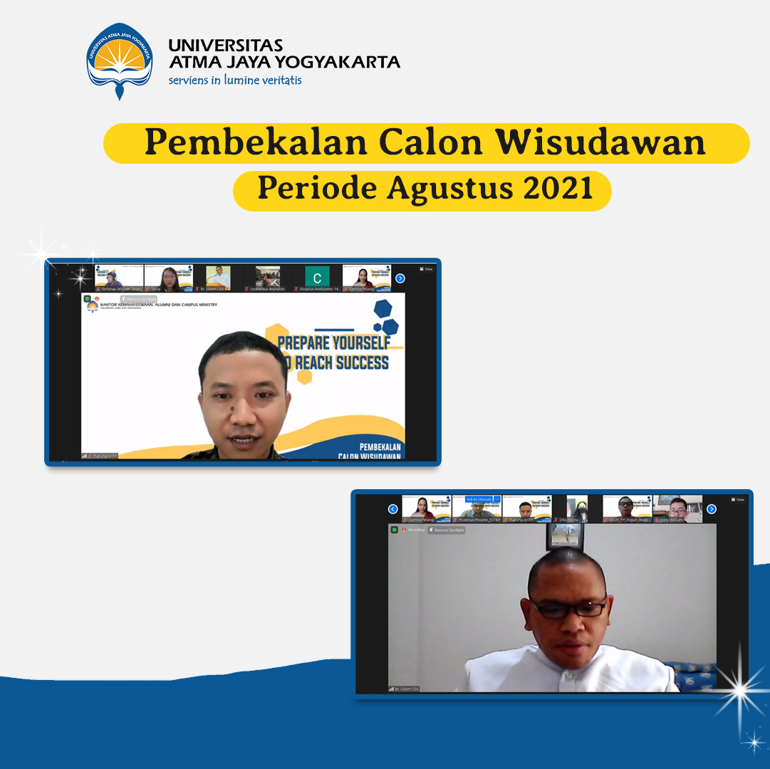 Universitas Atma Jaya Yogyakarta melalui Kantor Kemahasiswaan, Alumni dan Campus Ministry kembali menggelar kegiatan pembekalan untuk Pengurus Harian (PH) UKM Periode TA 2021/2022. Kegiatan yang dihadiri oleh 26 UKM ini telah dilaksanakan pada hari Senin, 23 Agustus 2021 secara daring melalui Ms. Teams. Doa pembuka dihantarkan oleh Br. Libert, CSA untuk mengawali kegiatan pembekalan. Selanjutnya Bapak B. Yudi Dwiandiyanta, S.T., M.T. selaku Kepala Kantor KACM memberikan pengarahan terkait hal-hal penting bagi UKM dan penyesuaian di masa pandemi. Pemaparan materi tentang pilihan diri serta administrasi UKM disampaikan oleh Bapak Y.Y. Teguh Widodo selaku Kepala Bagian Kemahasiswaan dan Alumni beserta staf. Selain itu Romo Yohanes Riyanto, Pr dan Suster Florentine, OP juga memberikan pembekalan tentang Kepemimpinan Komunitas, seperti gambaran umum pemimpin yaitu memiliki jiwa visioner, influence/motivate dan empowers people dalam komunitas dengan keutamaan nilai team work, team player dan team building.