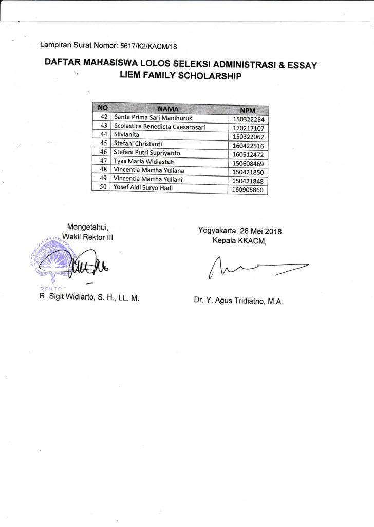 PENGUMUMAN SELEKSI ADMINISTRASI & ESSAY LIEM FAMILY SCHOLARSHIP
