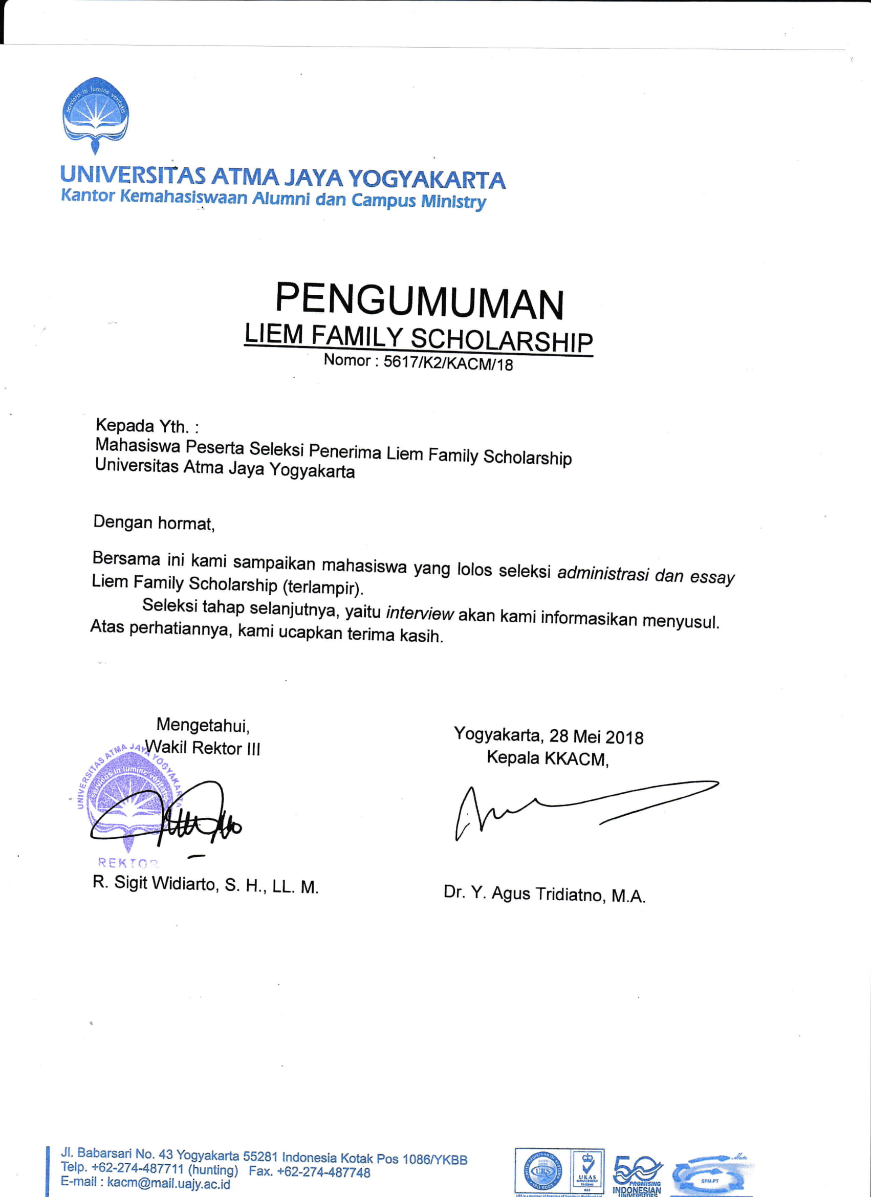 PENGUMUMAN SELEKSI ADMINISTRASI & ESSAY LIEM FAMILY SCHOLARSHIP