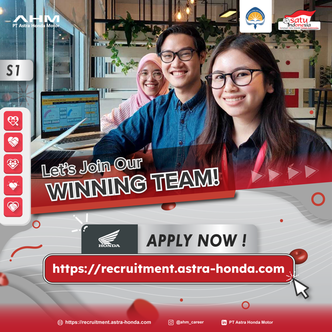 UAJY bekerjasama dengan PT ASTRA HONDA MOTOR (AHM), hendak mengadakan event tentang Company Session, Career Preparation, and Selection Process yang akan diselenggarakan secara offline di Kampus UAJY. Event menarik ini diadakan khusus untuk alumni serta mahasiswa tingkat akhir UAJY, yang akan diselenggarakan pada: