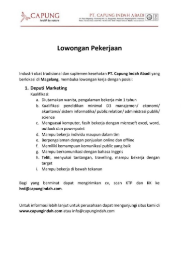 Info lowongan pekerjaan di PT. Capung Indah AbadiPosisi yang dibutuhkan: