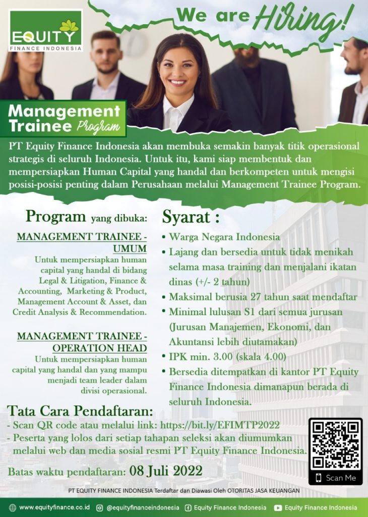 Info lowongan pekerjaan di PT. Equity Finance Indonesia. Posisi yang dibutuhkan:1. MANAGEMENT TRAINEE – UMUM2. MANAGEMENT TRAINEEOPERATION HEAD
