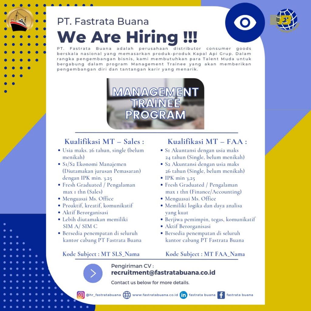 [LOWONGAN KERJA]Info lowongan pekerjaan PT Fastrata Buana (Kapal Api Group), Posisi yang dibutuhkan:• Management Trainee Program