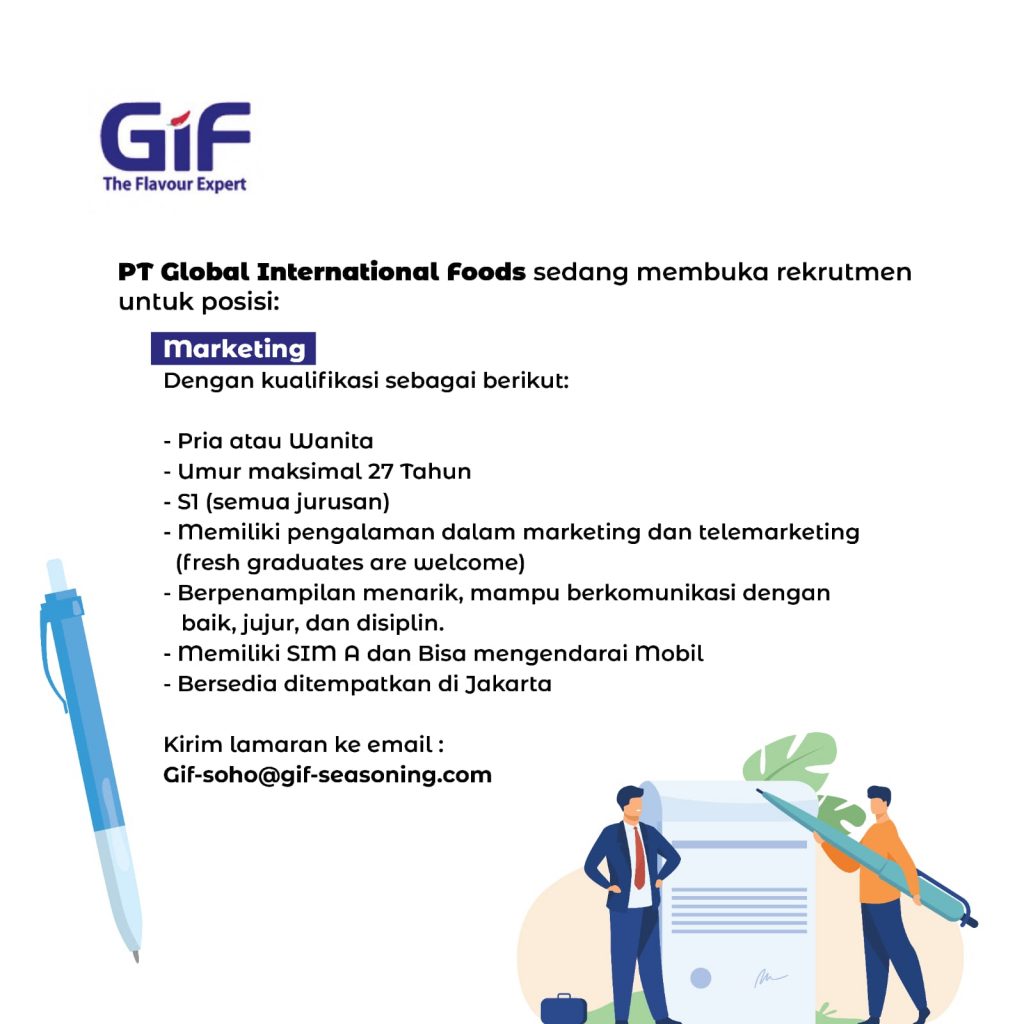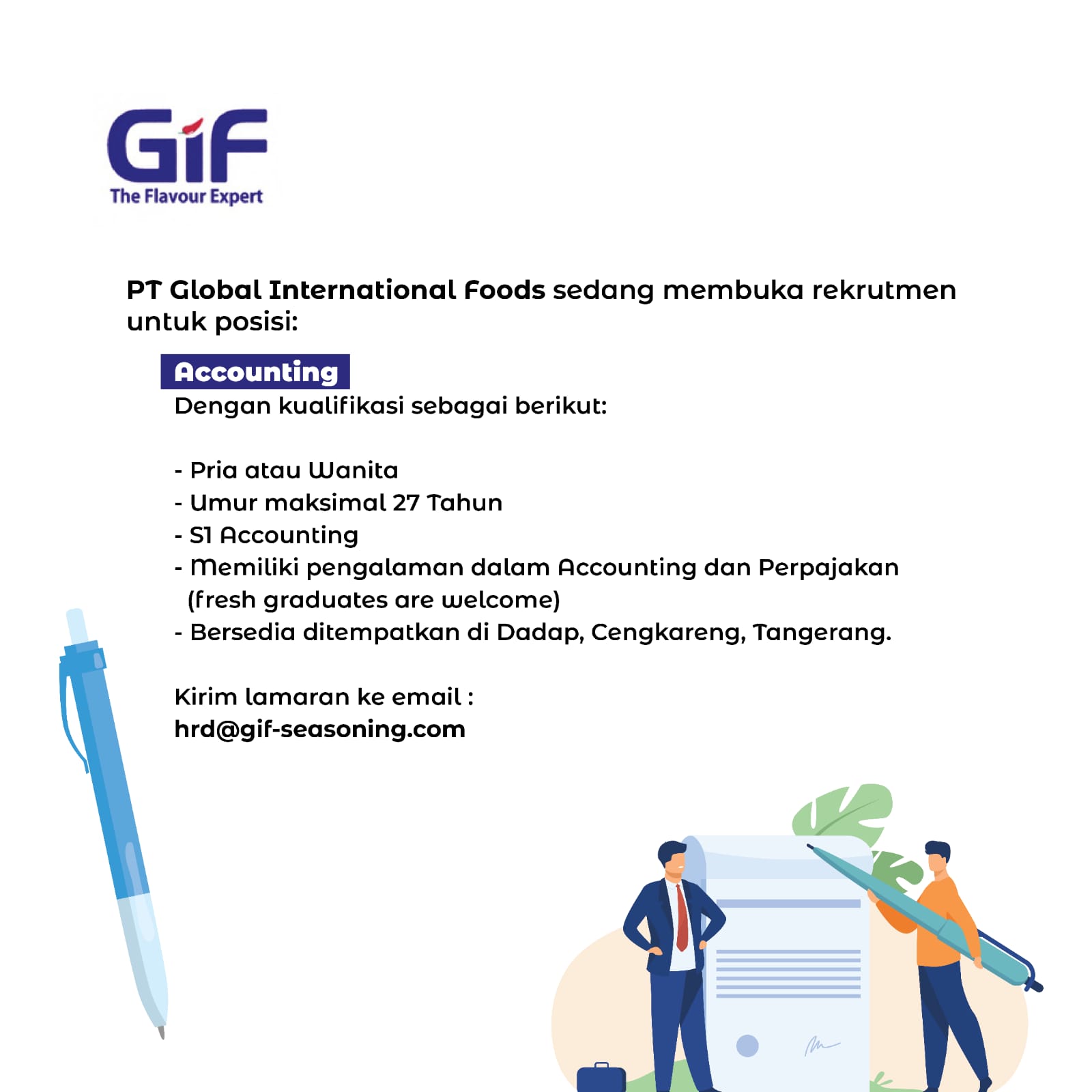 [LOWONGAN KERJA]Info lowongan pekerjaan PT GLOBAL INTERNATIONAL FOODS, Posisi yang dibutuhkan:• Accounting• Marketing