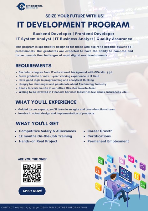 Info lowongan pekerjaan di PT Inti Corpora Teknologi. Posisi yang dibutuhkan:1. IT DEVELOPMENT PROGRAM– Backend Developer– Frontend Developer– IT System Analyst– IT Business Analyst– Quality Assurance