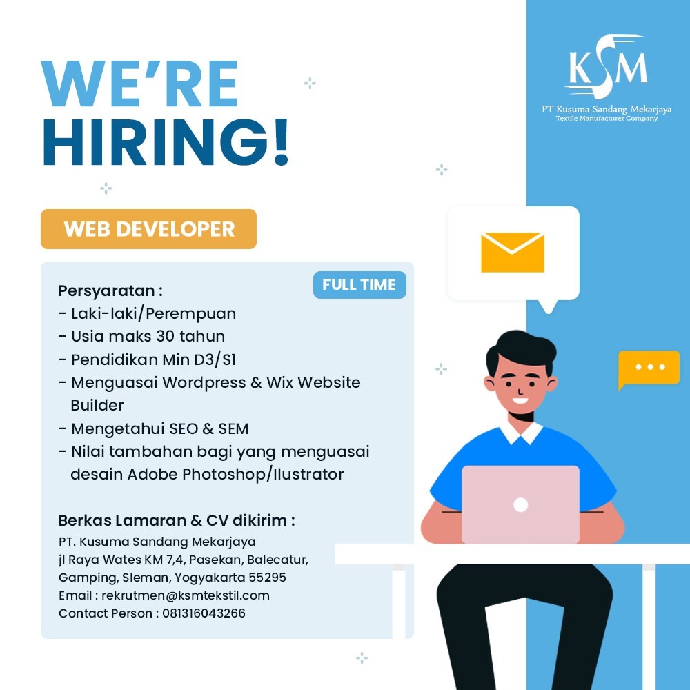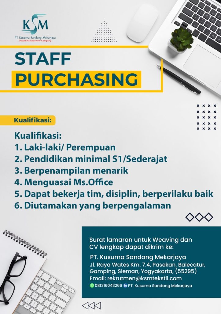 Info lowongan pekerjaan di PT. KUSUMA SANDANG MEKARJAYA. Posisi yang dibutuhkan:1. STAFF PURCHASING2. WEB DEVELOPER