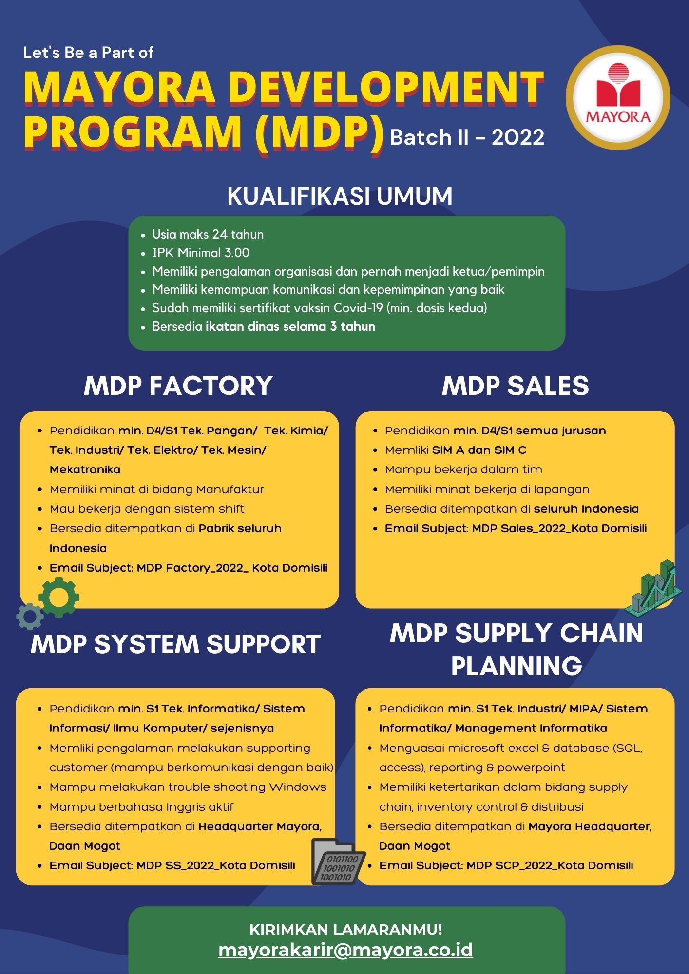 Info lowongan pekerjaan PT Mayora Indah, Posisi yang dibutuhkan:• Mayora Development Program