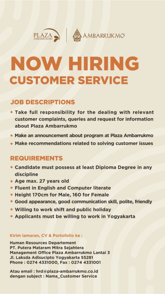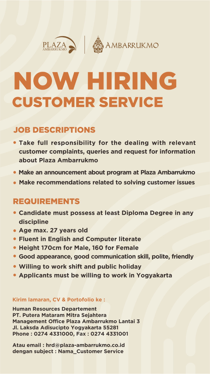 Info lowongan pekerjaan di PT. Putera Mataram Mitra Sejahtera (Ambarrukmo Plaza). Posisi yang dibutuhkan:1. Customer Service