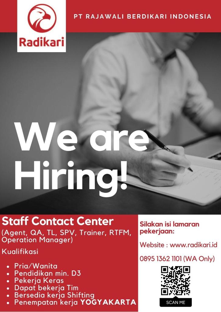 Info lowongan pekerjaan di PT RAJAWALI BERDIKARI INDONESIA, Posisi yang dibutuhkan:1. Staff Contact Center:– Agent– QA– TL– SPV– Trainer– RTFM– Operation Manager
