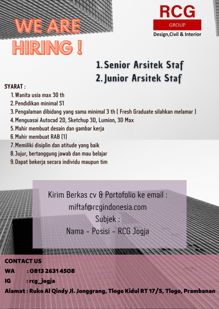 Info lowongan pekerjaan di PT REHAT CIPTA GRIYA GROUP. Posisi yang dibutuhkan:1. Senior Arsitek Staf2. Junior Arsitek Staf