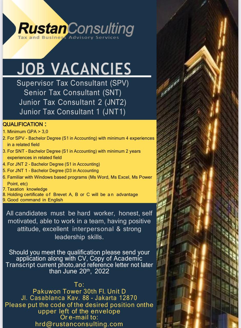 Info lowongan pekerjaan di PT. Rustan Consulting. Posisi yang dibutuhkan:1. Supervisor Tax Consultant (SPV)2. Senior Tax Consultant (SNT)3. Junior Tax Consultant 2 (JNT2)4. Junior Tax Consultant 1 (JNT1)