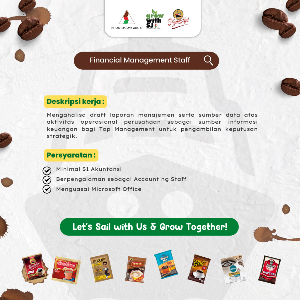 Info lowongan pekerjaan di PT Santos Jaya AbadiPosisi yang dibutuhkan:1. Cantinuous Improvement2. Financial Management Staff3. People and Process Development