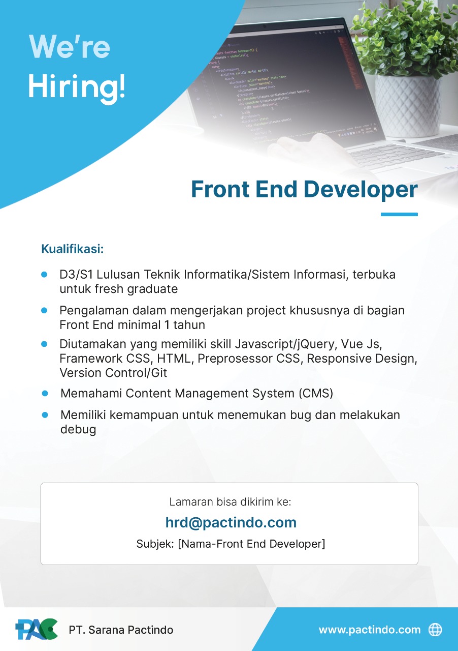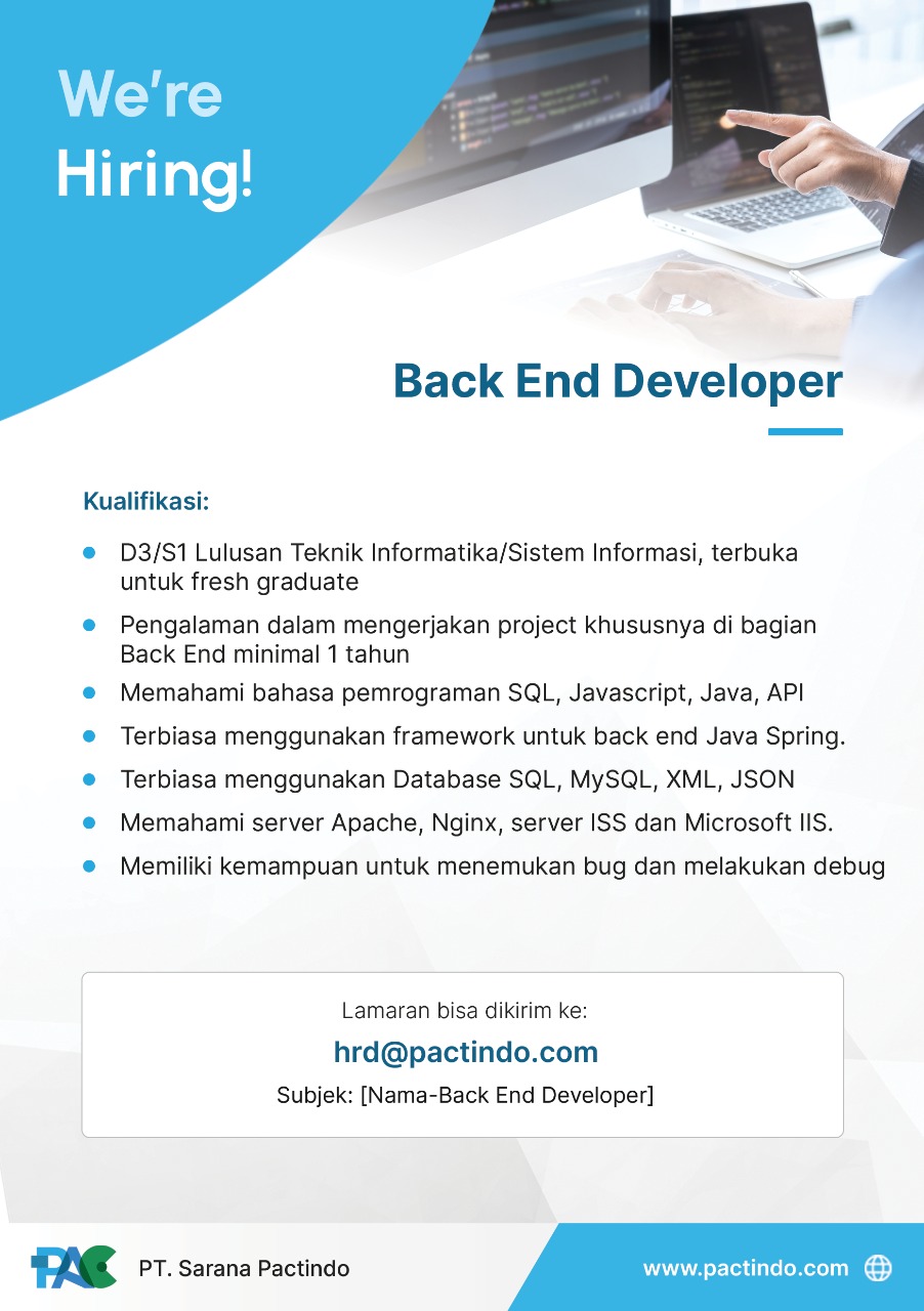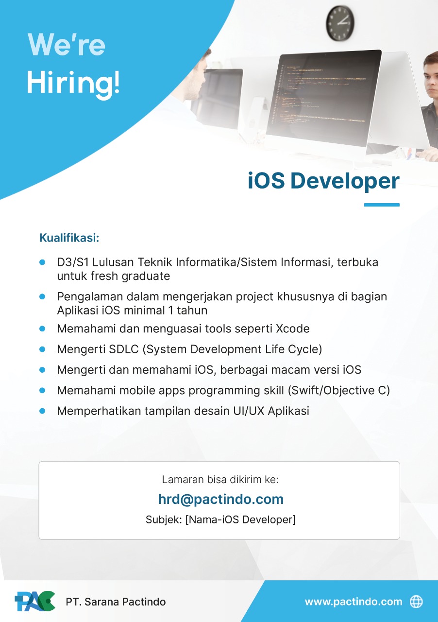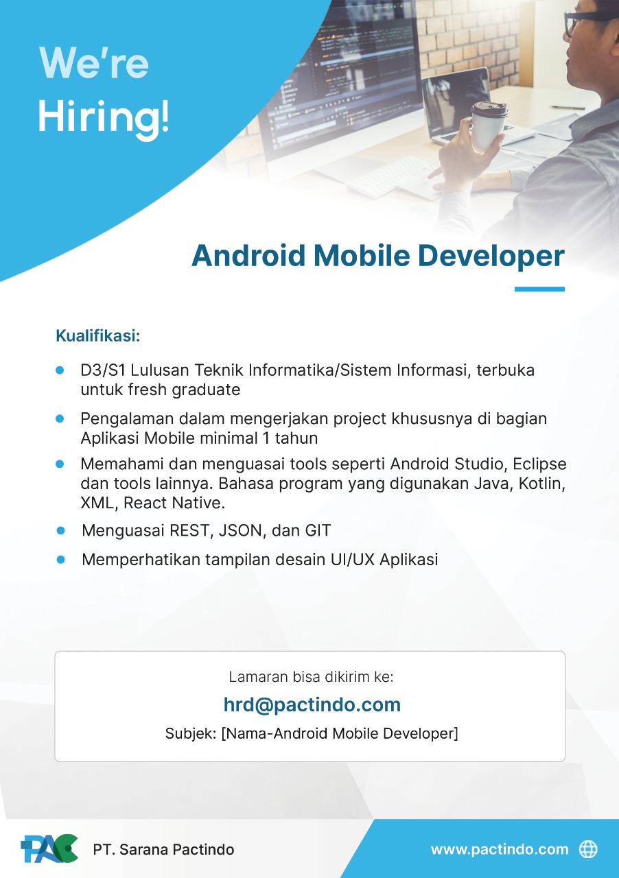 [LOWONGAN KERJA]Info lowongan pekerjaan PT SARANA PACTINDO, Posisi yang dibutuhkan:• Android Mobile Developer• Back End Developer• Front End Developer• IOS Developer