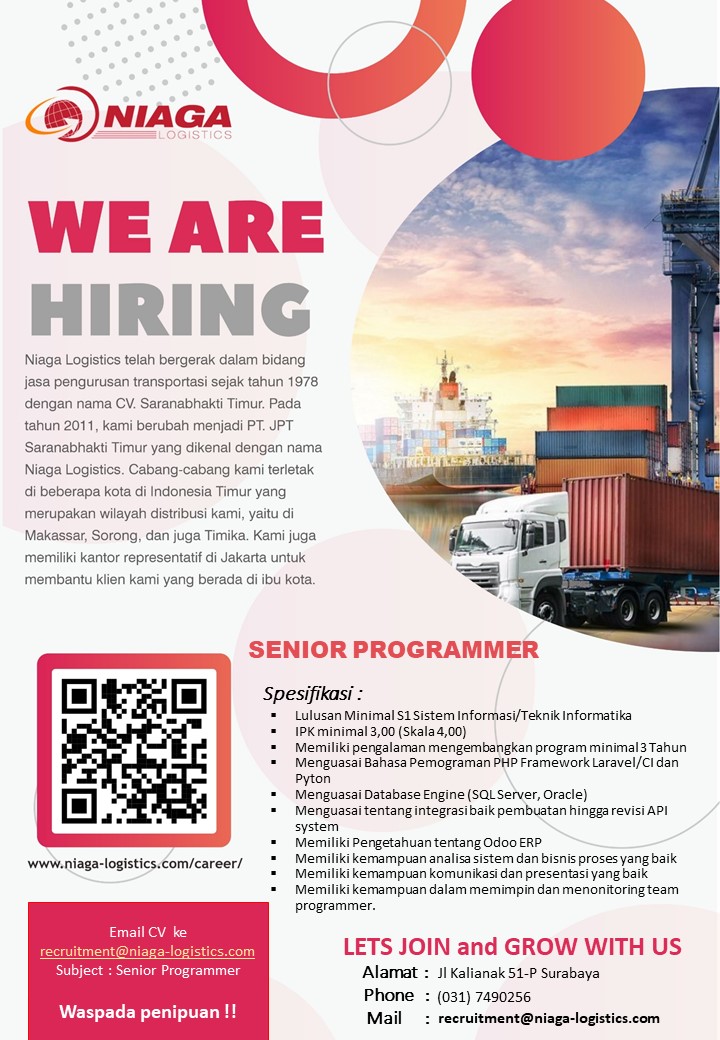 Info lowongan pekerjaan di PT SARANABHAKTI TIMUR (NIAGA LOGISTICS). Posisi yang dibutuhkan:1. Senior Programmer
