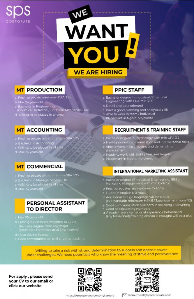 Info lowongan pekerjaan di PT SPS CORPORATE. Posisi yang dibutuhkan:1. MT Production2. MT Accounting3. MT Commercial4. Personal Assistant to Director5. PPIC Staff6. Recruitment and Training Staff7. International Marketing Assistant