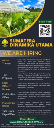 Info lowongan Pekerjaan di PT Sumatera Dinamika UtamaPosisi yang dibutuhkan:1. ASISTEN TRAINEE2. TED PROGRAM3. LEGAL OFFICER/HUMAS4. CERTIFICATION OFFICER5. PROCUREMENT OFFICER6. TATA USAHA KAYU OFFICER