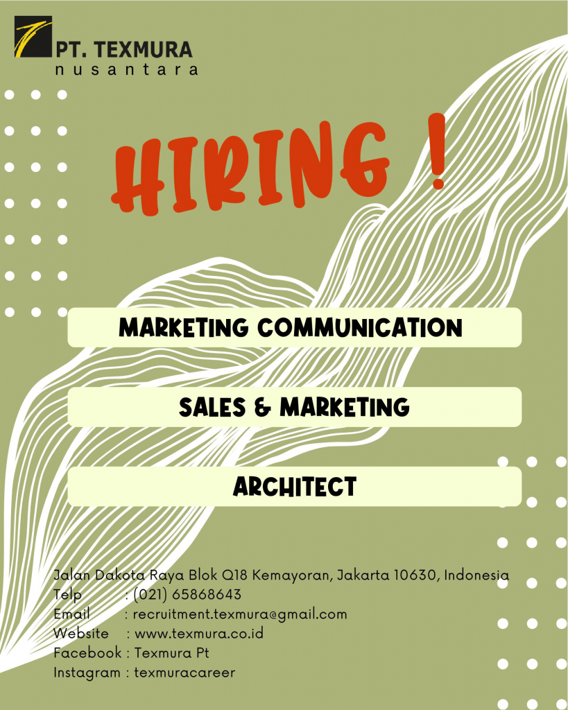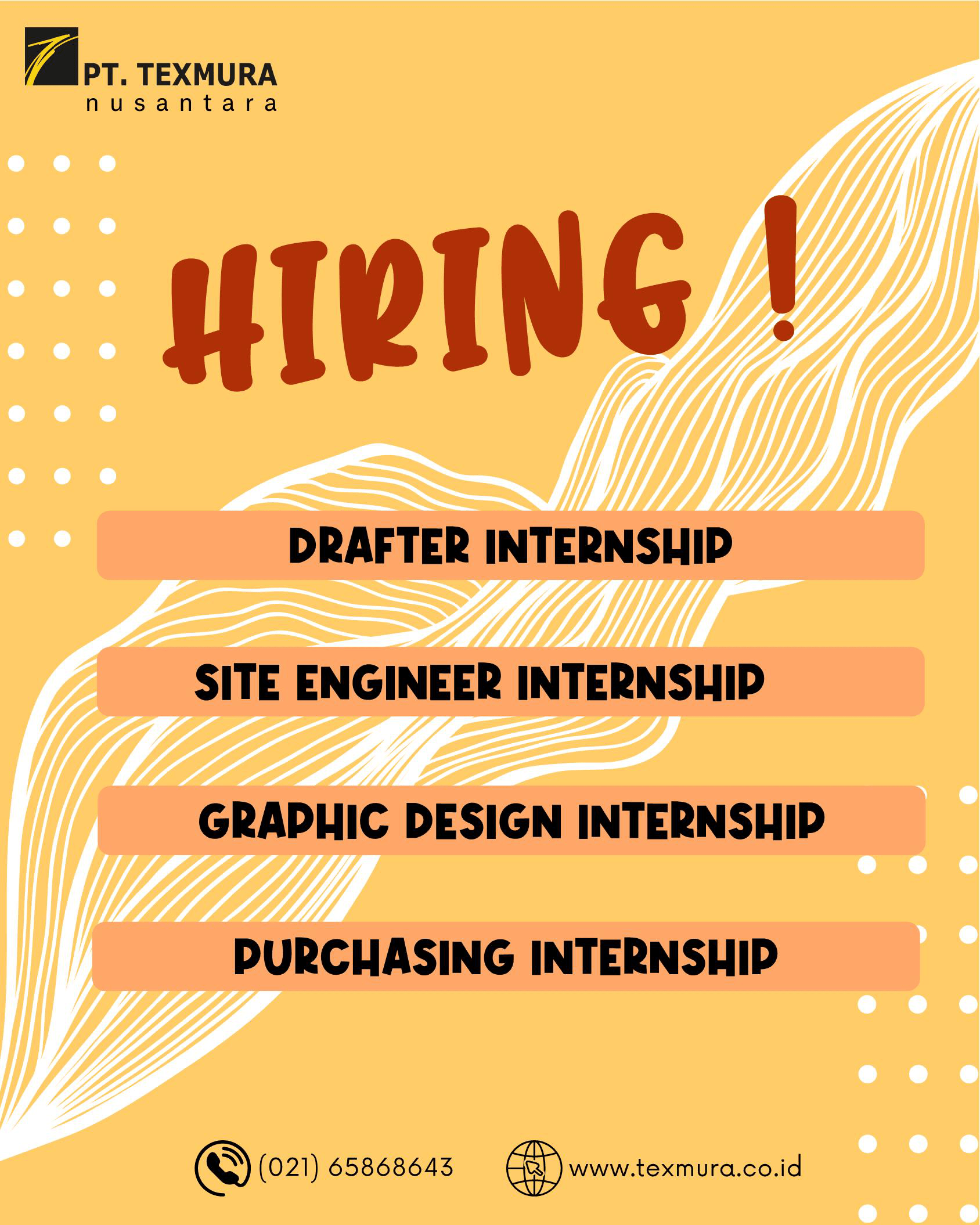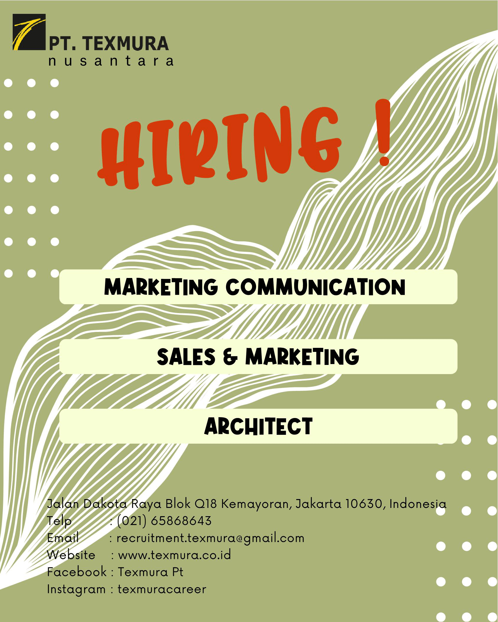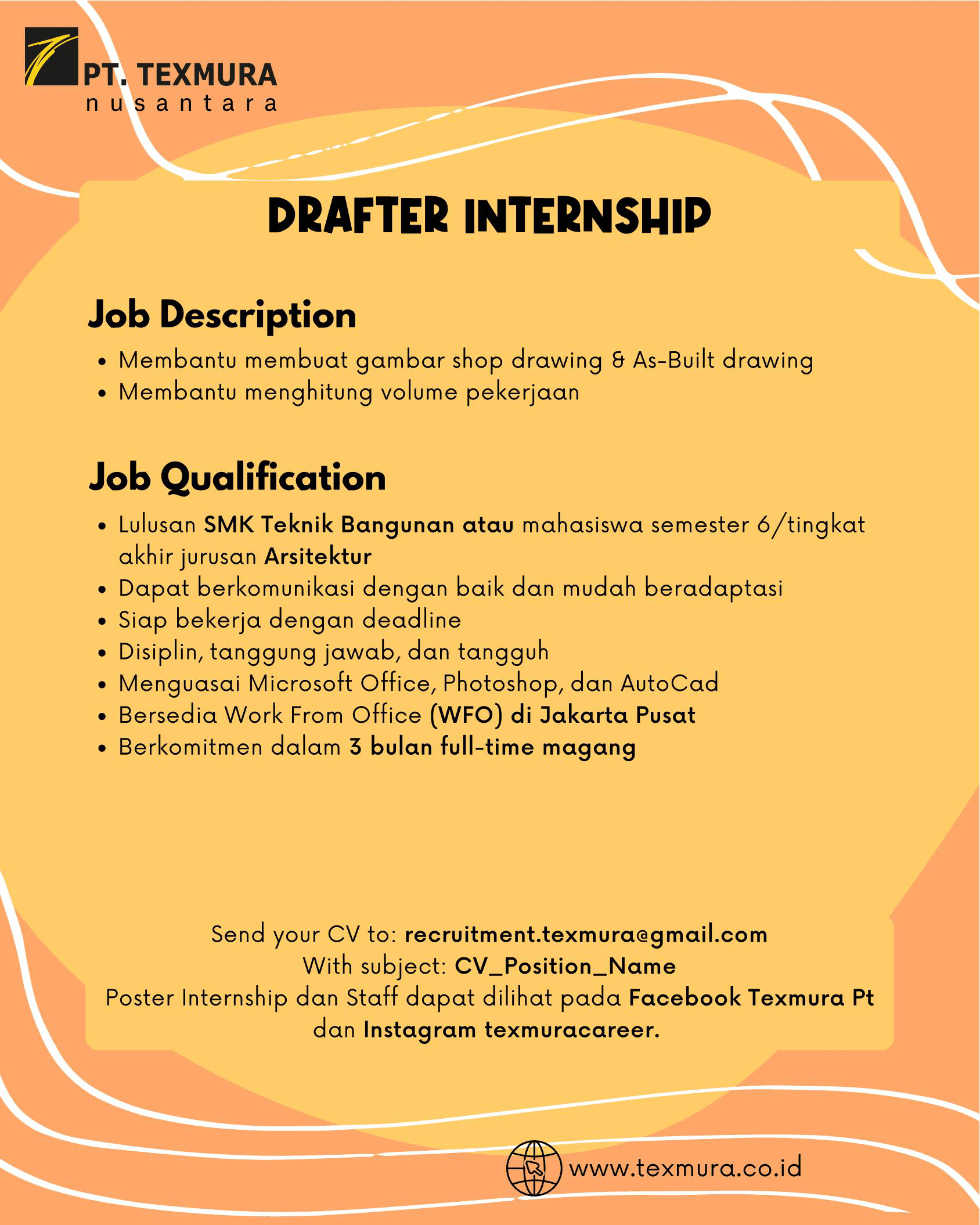 Info lowongan pekerjaan di PT. Texmura. Posisi yang dibutuhkan:1. DRAFTER INTERNSHIP2. SITE ENGINEER INTERNSHIP3. GRAPHIC DESIGN INTERNSHIP4. PURCHASING INTERNSHIP5. MARKETING COMMUNICATION6. SALES & MARKETING7. ARCHITECT