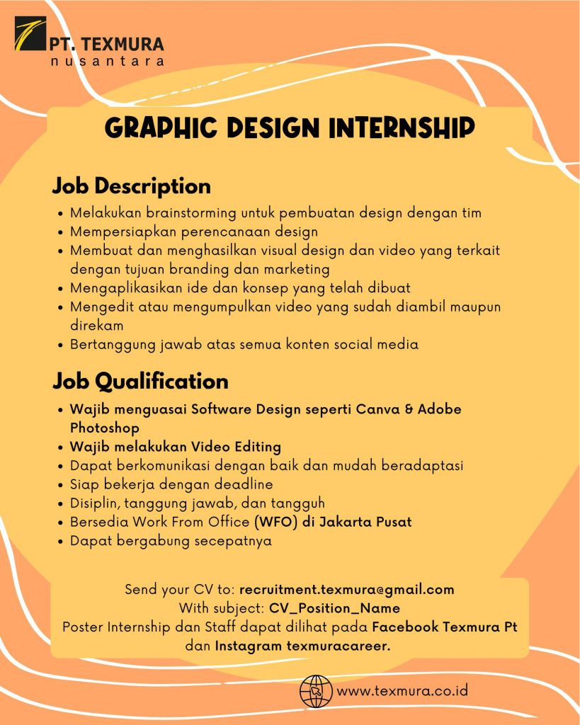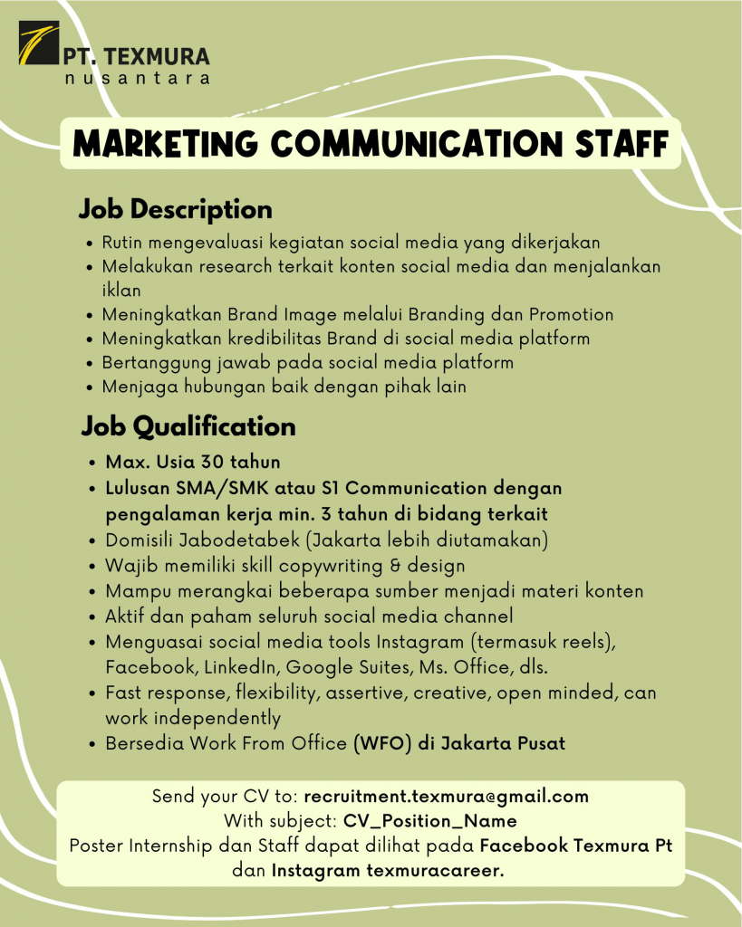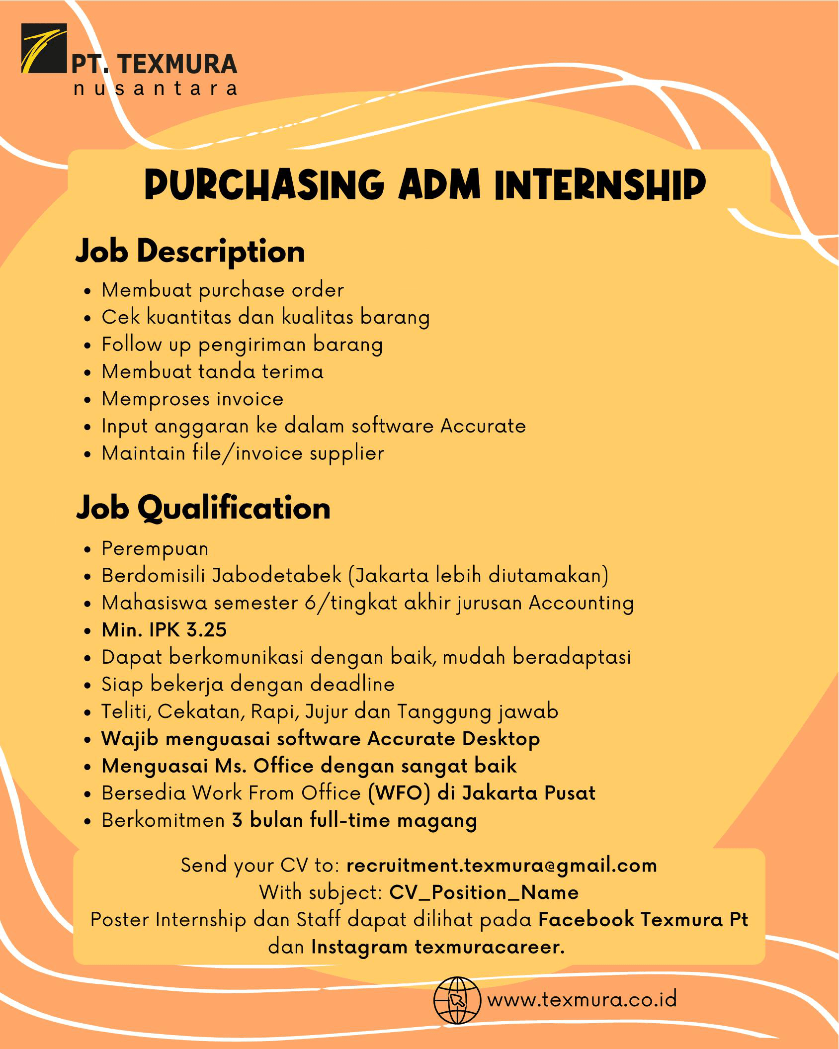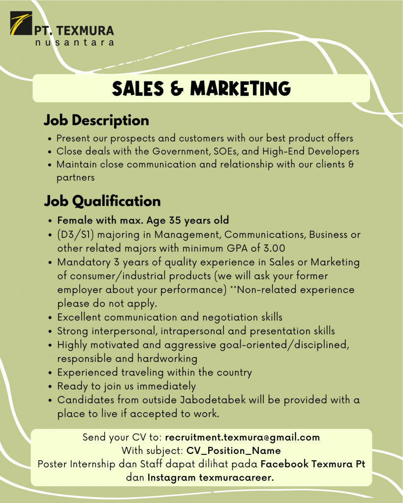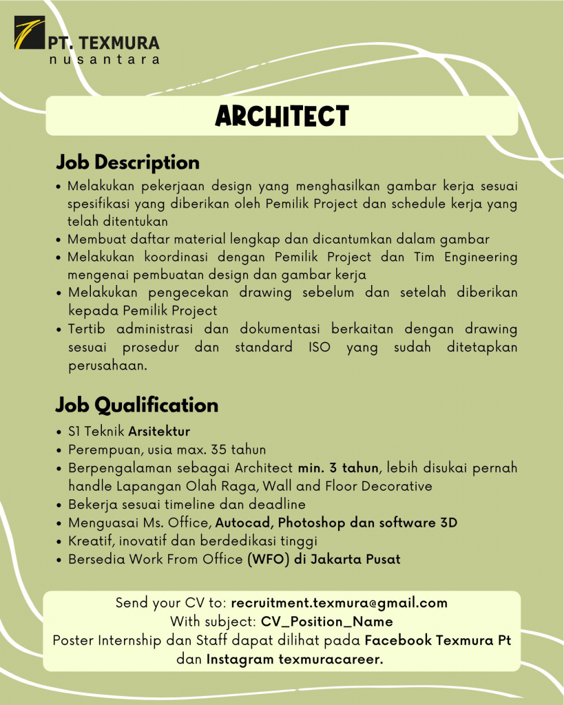 Info lowongan pekerjaan di PT. Texmura. Posisi yang dibutuhkan:1. DRAFTER INTERNSHIP2. SITE ENGINEER INTERNSHIP3. GRAPHIC DESIGN INTERNSHIP4. PURCHASING INTERNSHIP5. MARKETING COMMUNICATION6. SALES & MARKETING7. ARCHITECT