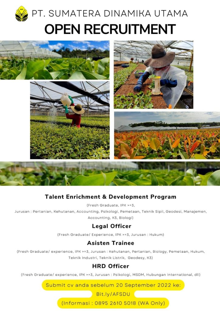 Info lowongan pekerjaan di PT. SUMATERA DINAMIKA UTAMA. Posisi yang dibutuhkan:1. TALENT ENRICHMENT & DEVELOPMENT PROGRAM2. LEGAL OFFICER3. ASISTEN TRAINEE4. HRD OFFICER