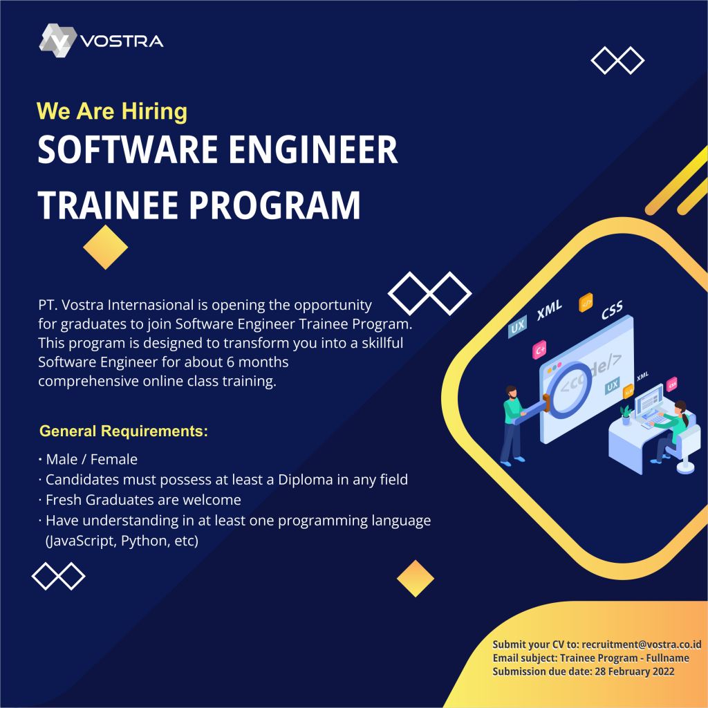 [LOWONGAN KERJA]Info lowongan pekerjaan PT VOSTRA INTERNATIONAL, Posisi yang dibutuhkan:• Software Engineer Trainee Program