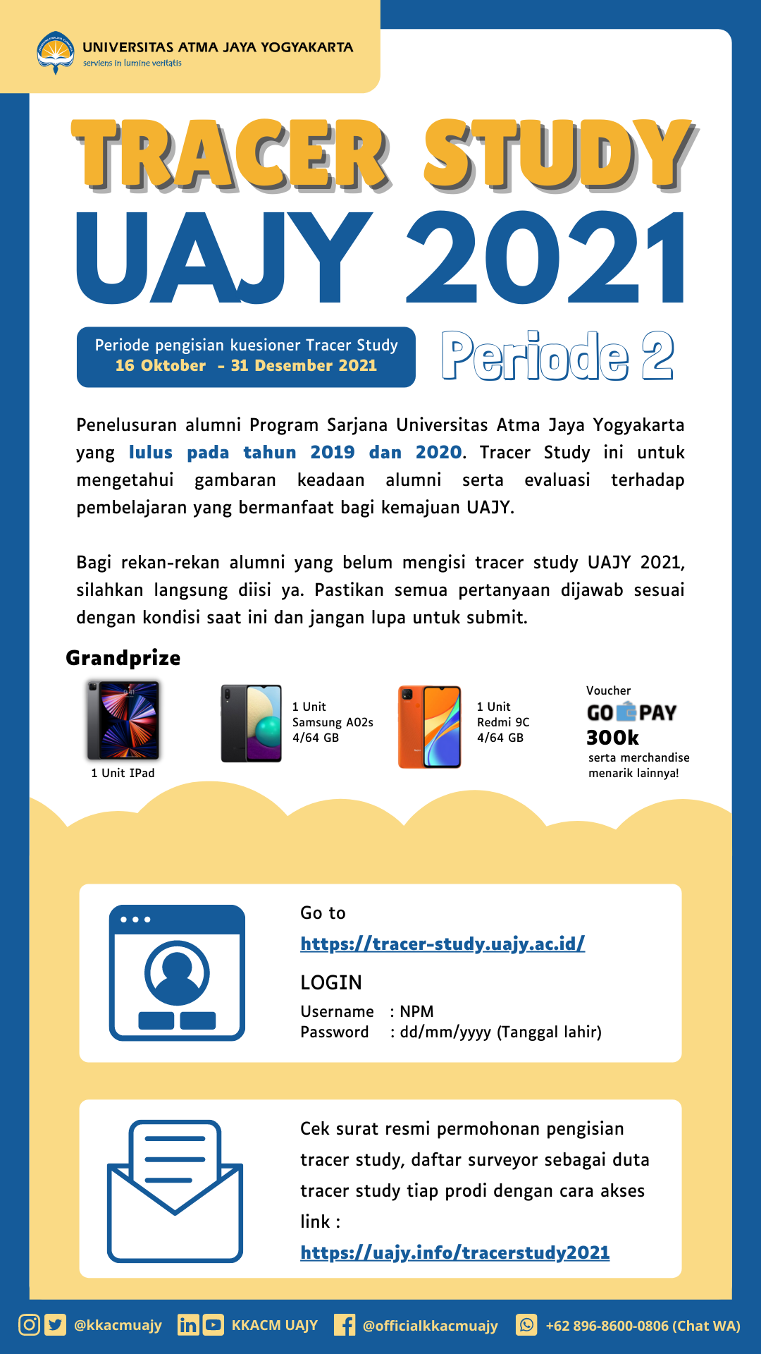 KKACM memberikan info penting bagi kalian alumni UAJY tahun 2019 & 2020, untuk diharapkan berpartisipasi mengisi kuesioner Tracer Study.
