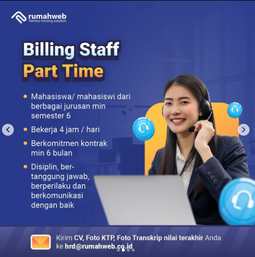 Info lowongan Pekerjaan di Rumah Web IndonesiaPosisi yang dibutuhkan:1. BILLING STAFF PART TIME2. DESIGNER GRAFIS FULL TIME3. TECHNICAL SUPPORT PART TIME