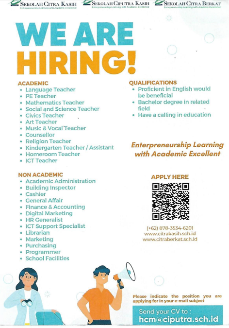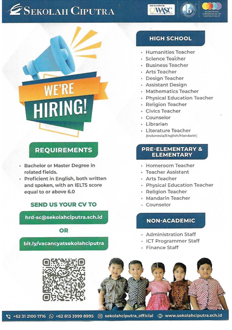 Info lowongan pekerjaan di SEKOLAH CIPUTRA. Posisi yang dibutuhkan: 1. TEACHER FOR HIGH SCHOOL,PRE-ELEMENTARY & ELEMENTARY, COUNSELOR, LIBRARIAN (ACADEMIC) 2. NON ACADEMIC COUNSELOR (ADMINISTRATION STAFF, ICT PROGRAMMER STAFF, FINANCE STAFF, CASHIER, dll.)