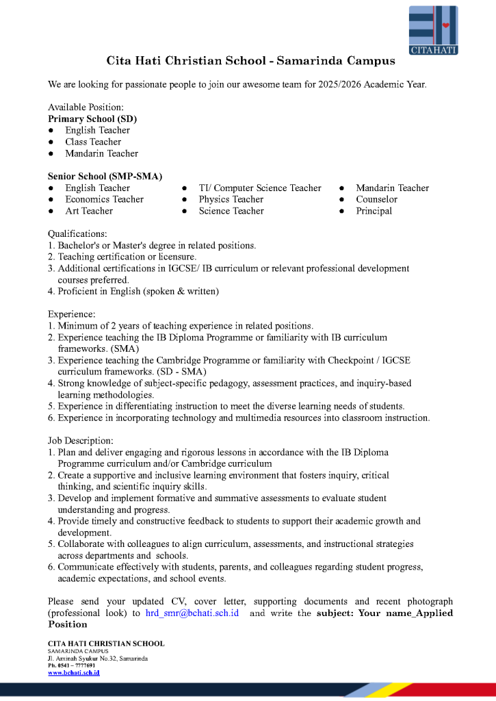 SEKOLAH KRISTEN CITA HATI CHRISTIAN SCHOOL- SAMARINDA CAMPUS
