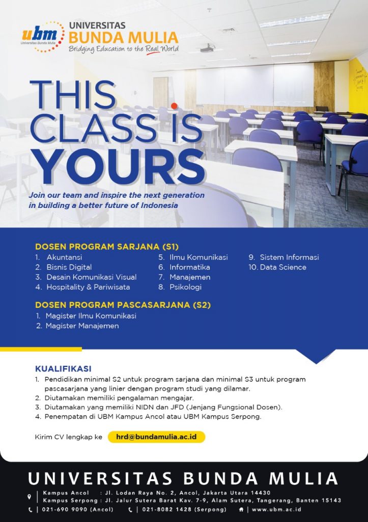[LOWONGAN KERJA]Info lowongan pekerjaan Universitas Bunda Mulia, Posisi yang dibutuhkan:• Dosen Program Sarjana (S1)• Dosen Program Pascasarjana (S2)