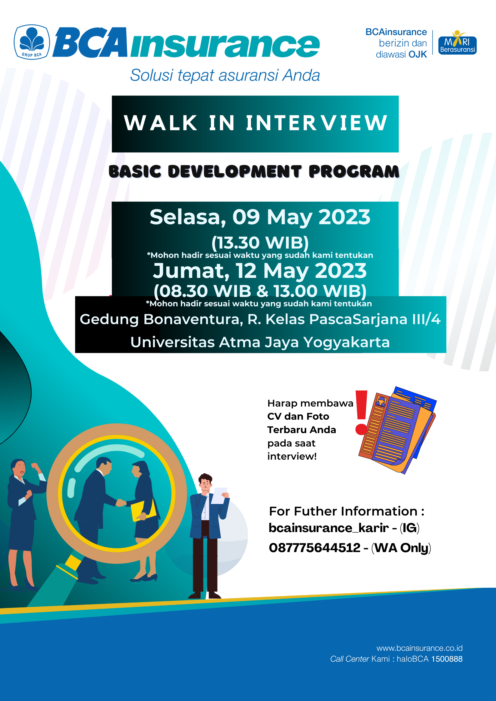 BCA INSURANCE akan mengadakan Walkin Interview “BASIC DEVELOPMENT PROGRAM” pada: