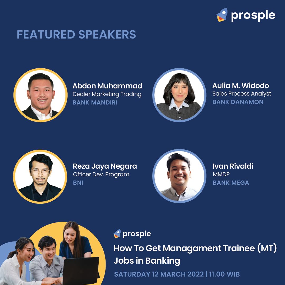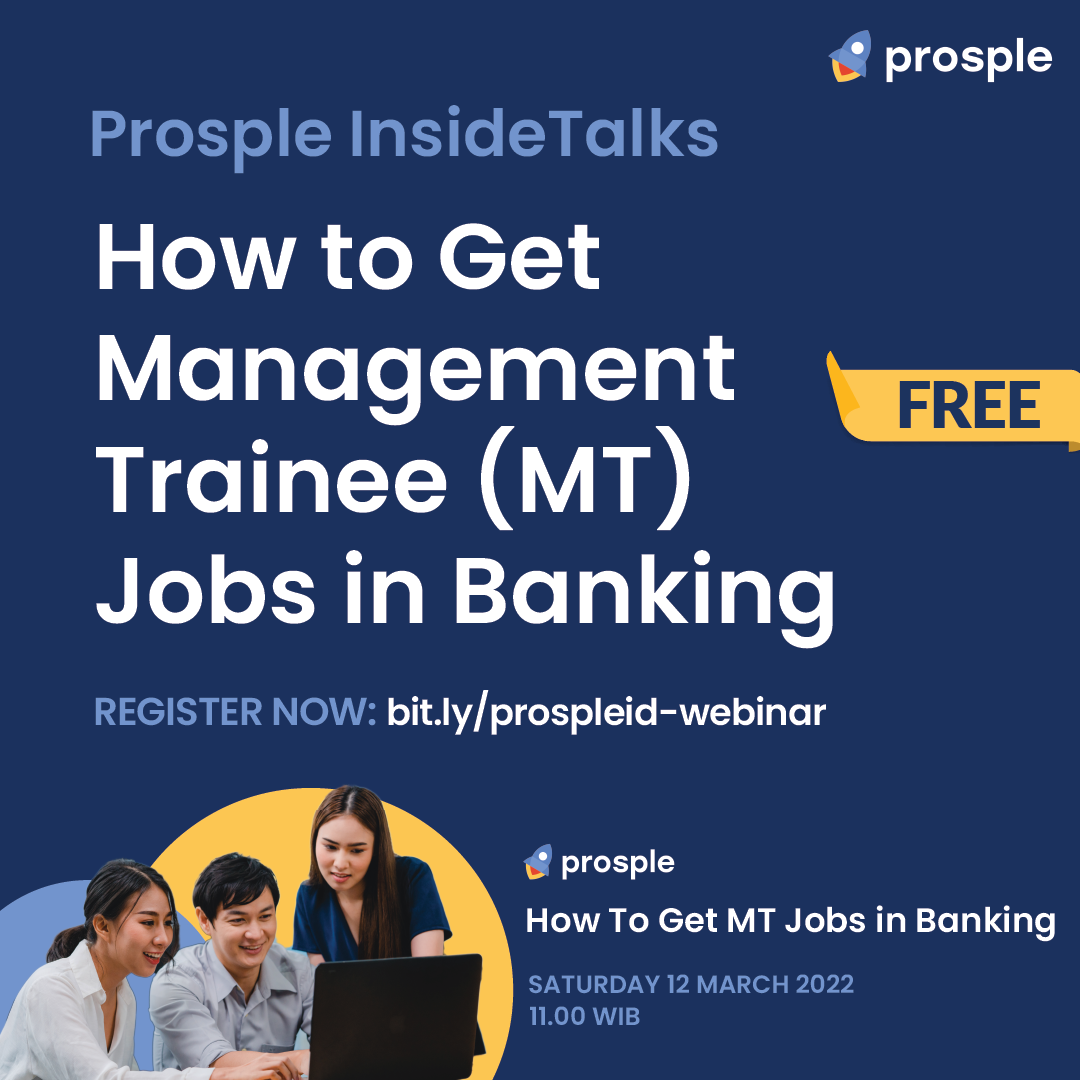 Yuk ikuti webinar dari Prosple Indonesia mengenai How to Get Management Trainee (MT) Jobs in Banking Industry! Event ini akan diadakan pada: