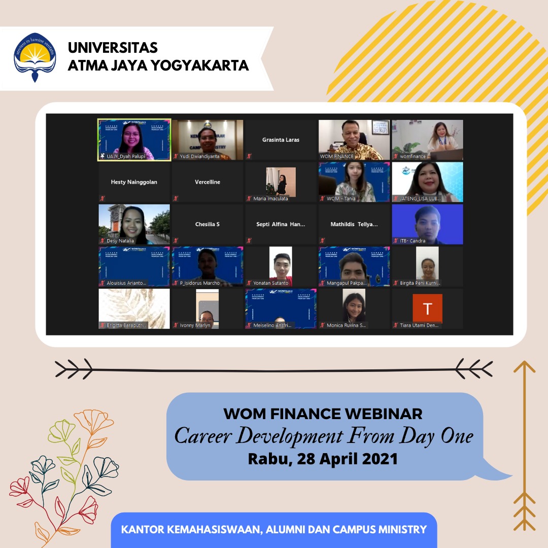 Dalam menjajaki dunia kerja, para lulusan baru sering kali merasa tidak siap dan ragu-ragu dalam menghadapi proses rekrutmen. Banyak dari mereka yang akhirnya gagal karena beberapa hal kecil akibat ketidaksiapan diri. Padahal, lulusan baru justru mempunyai potensi yang besar dan kesempatan lebih untuk memilih pekerjaan sesuai dengan keinginan hati. Maka dari itu, Kantor Kemahasiswaan Alumni dan Campus Ministry (KKACM) bekerja sama dengan WOM Finance mengadakan webinar Career Day pada tanggal 28 April 2021.