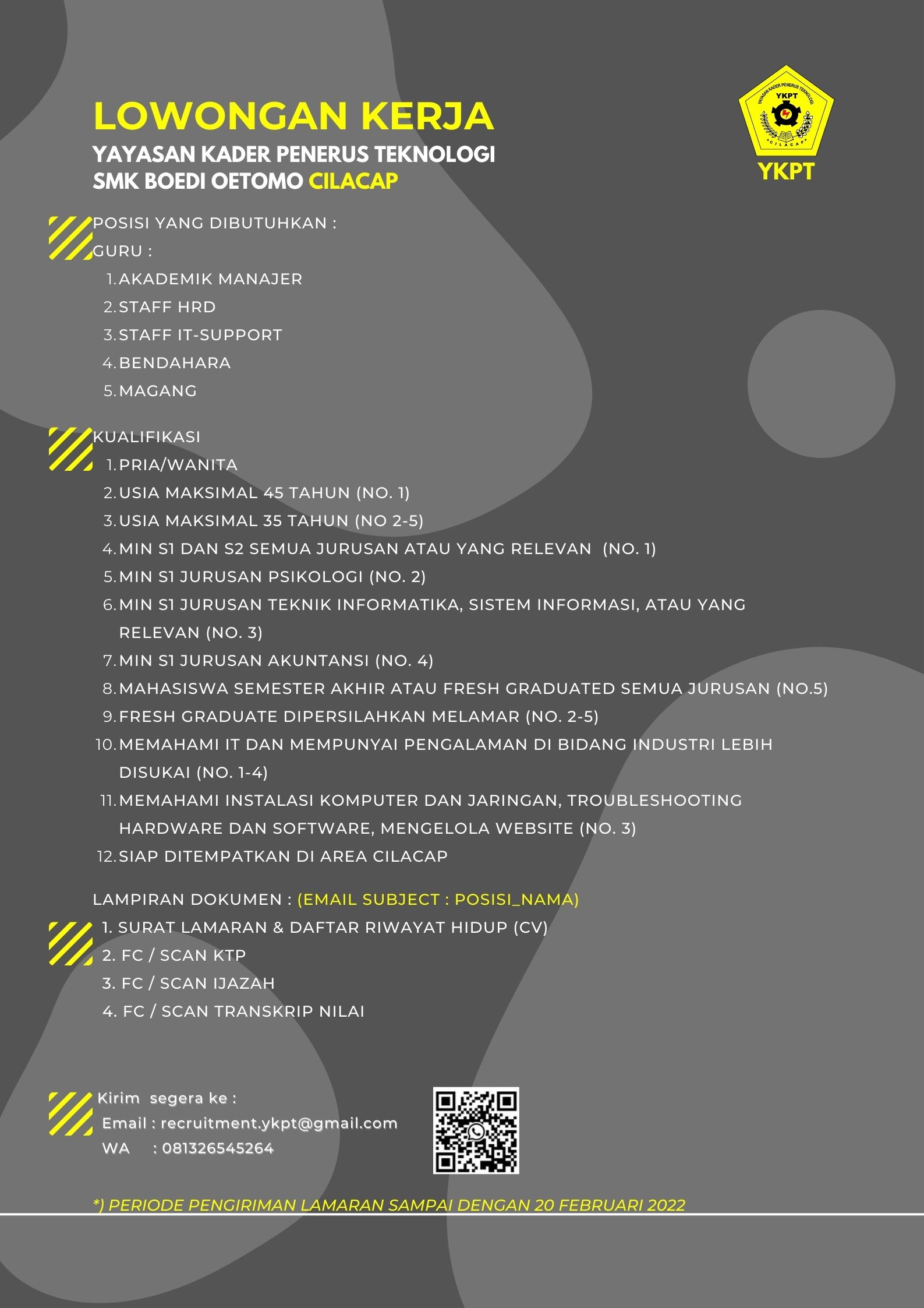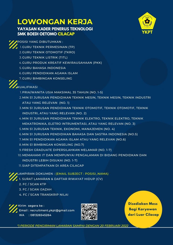 [LOWONGAN KERJA]Info lowongan pekerjaan Yayasan Kader Penerus Teknologi (SMK Boedi Oetomo Cilacap), Posisi yang dibutuhkan:• Guru• Non Guru